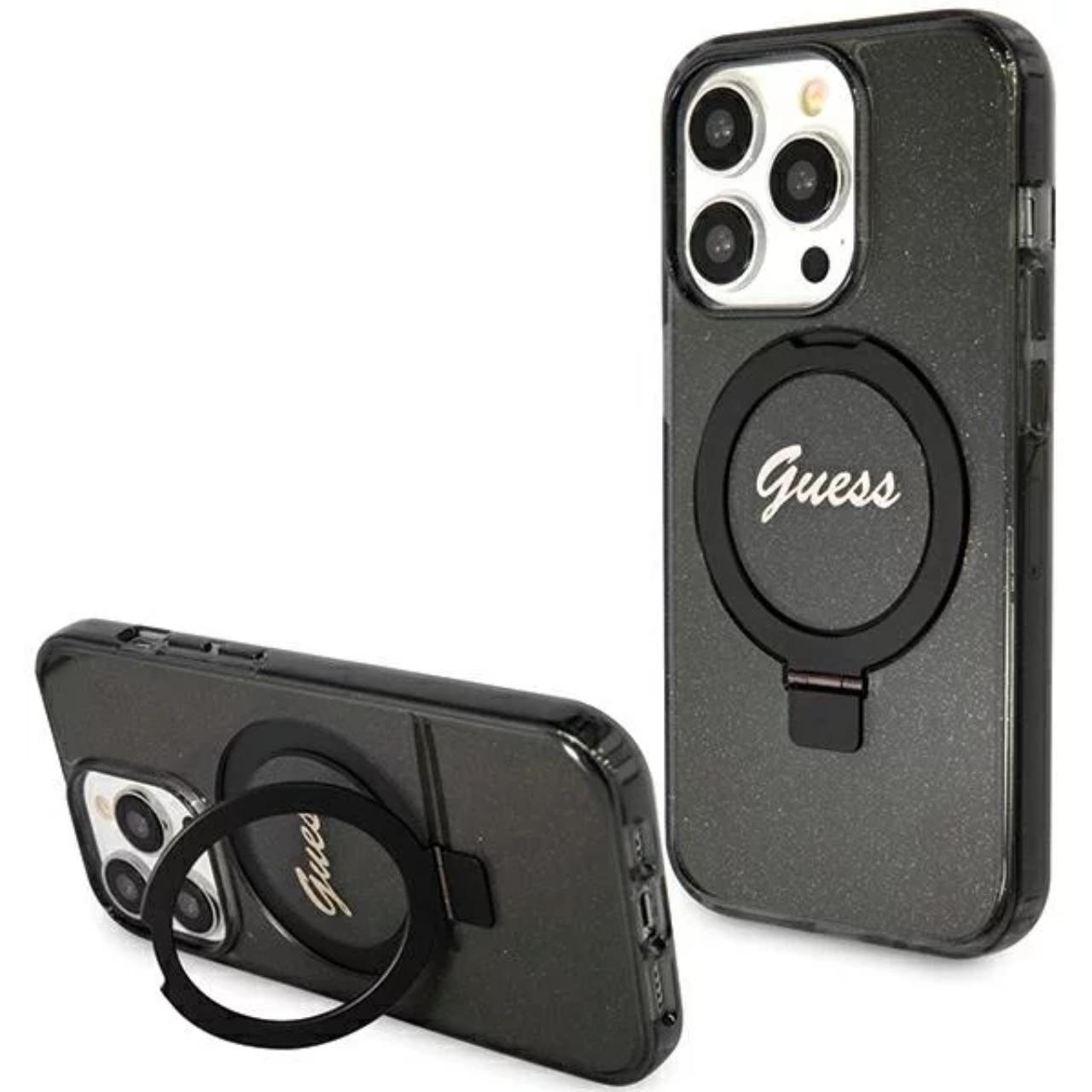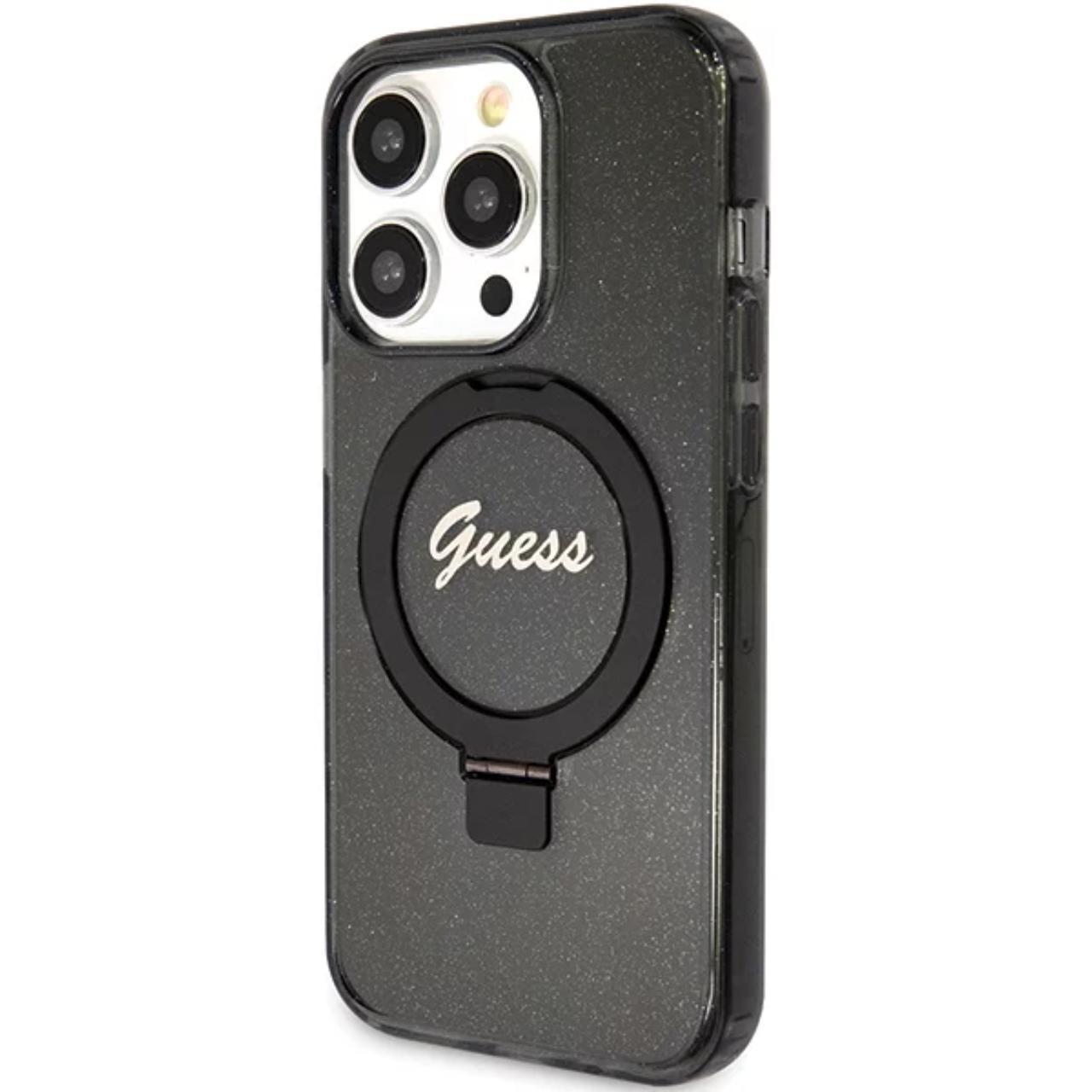 Guess Husa Ring Stand Glitter MagSafe iPhone 15 Pro Negru