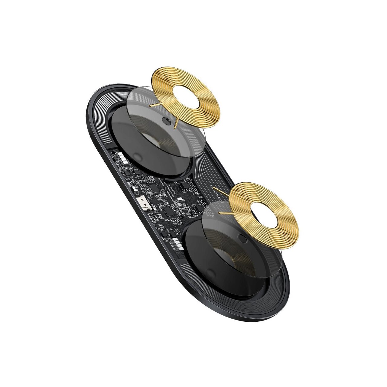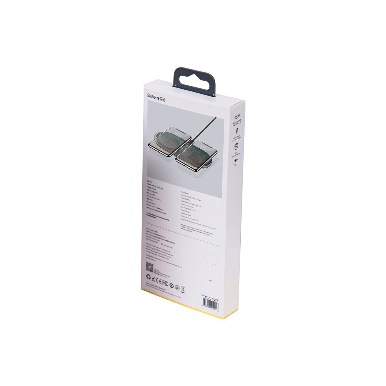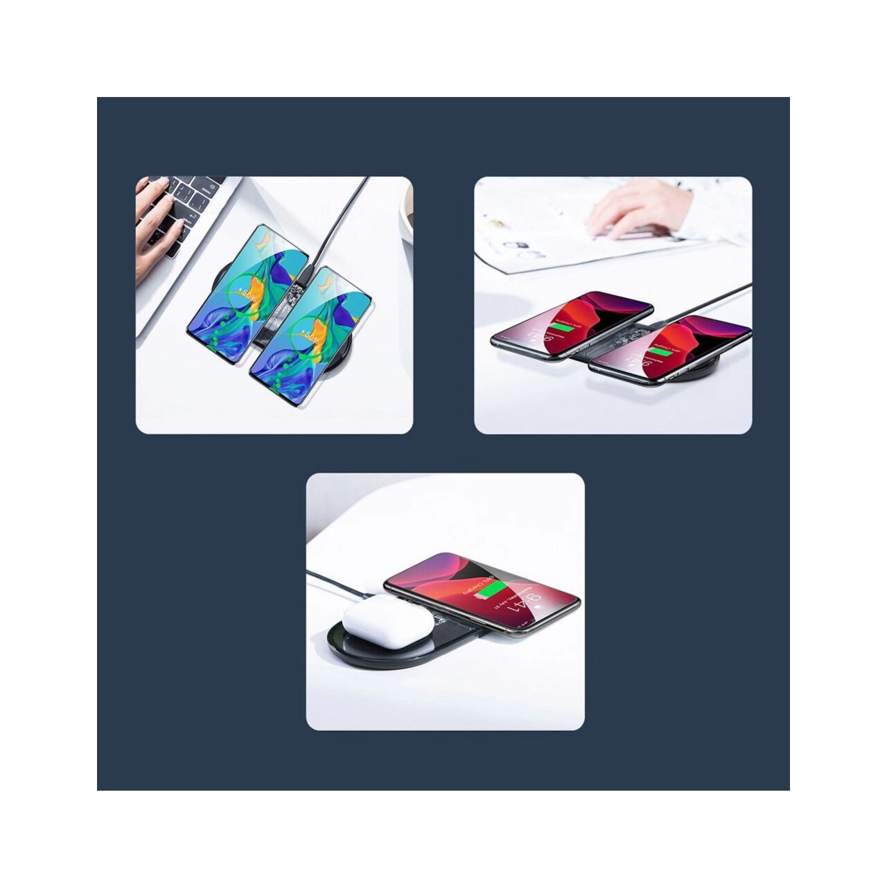 The Simple 2 in 1 Wireless charger from Baseus has small dimensions and an elegant, slim design, being only 8 mm thick. Allows charging of two QI (wireless charging) compatible devices simultaneously. You just have to place the devices on the stand and charging starts. The total maximum power is 15W when charging two devices simultaneously or 10W Max on one side. The charger automatically adapts the power depending on the device to be charged. For example, for two Android phones 10W + 5W, for two iPhones 7.5W + 7.5W or one iPhone and Airpods 7.5W + 2.5W.