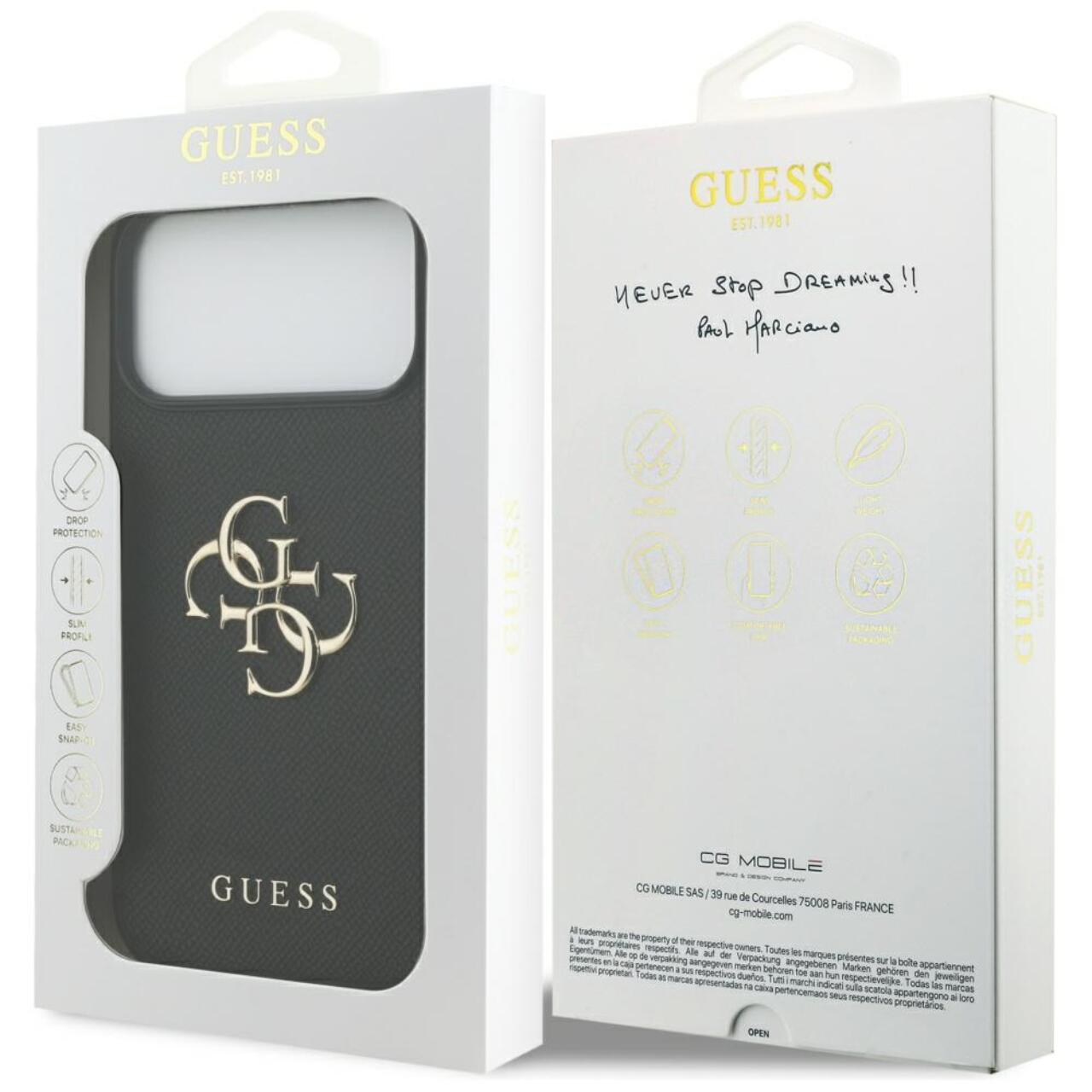 Husa 4G Grained Big and Classic Logo iPhone 17 Pro de la Guess, daca iubesti sa fii in centrul atentiei, aceasta husa eleganta si stilata este accesoriul perfect care iti va completa look-ul telefonului.