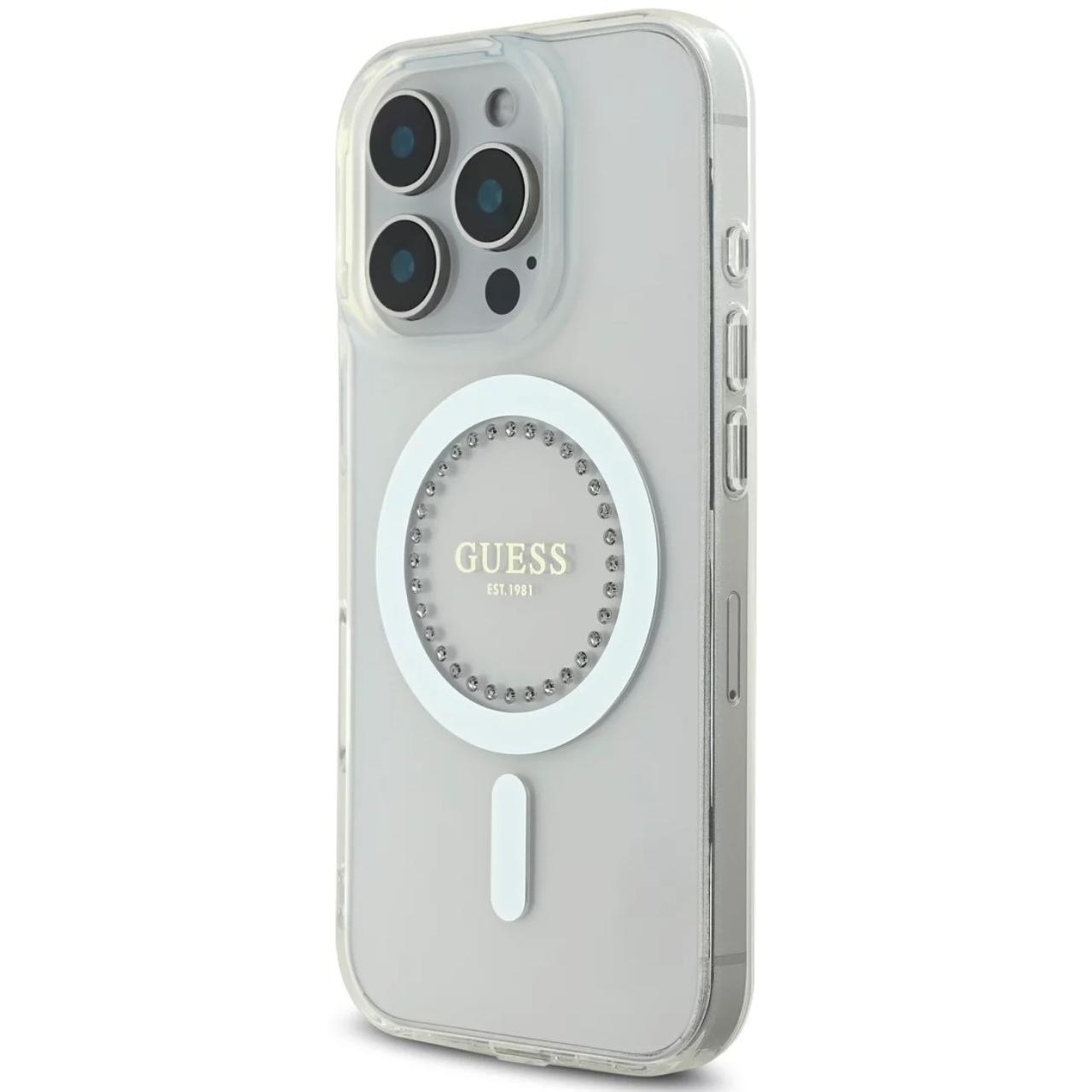 Guess Husa Rhinestones Ring MagSafe iPhone 16 Pro Max Alb