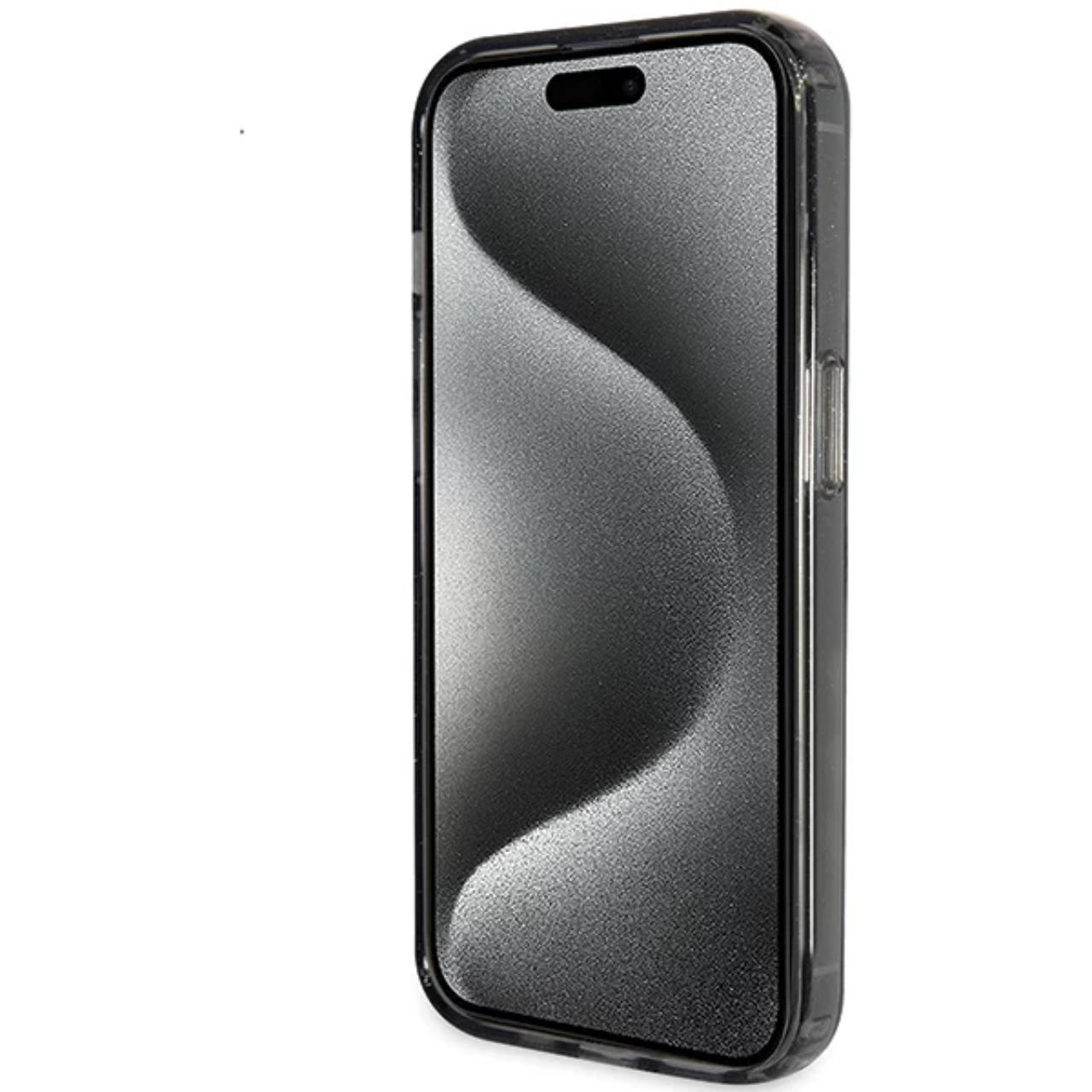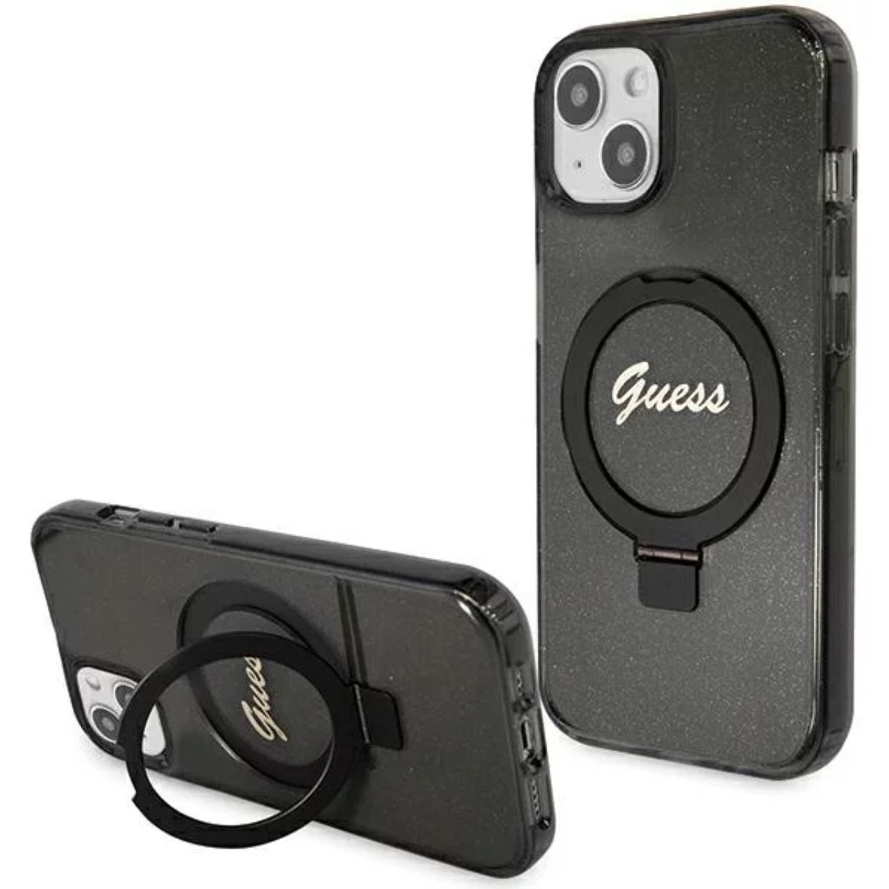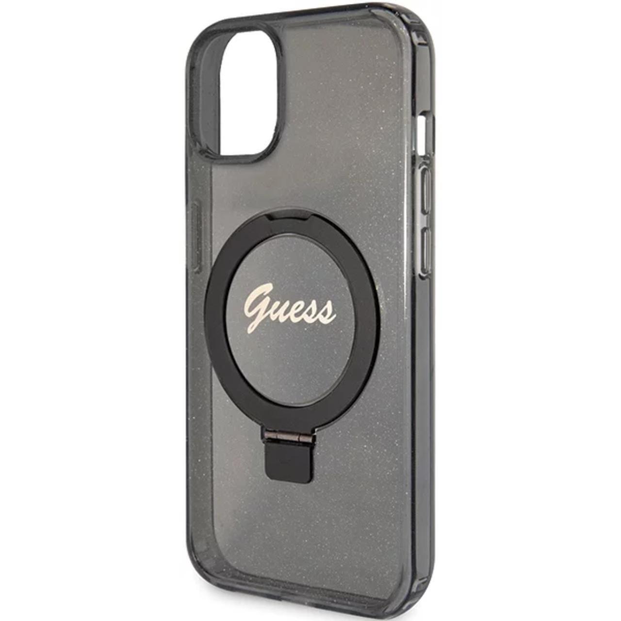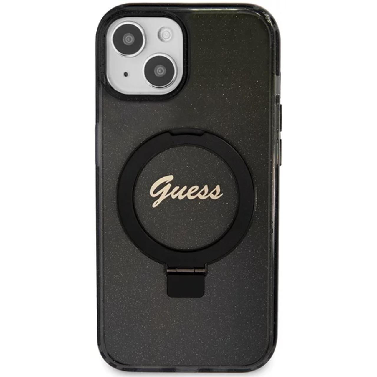 Guess Husa Ring Stand Glitter MagSafe iPhone 15 Negru