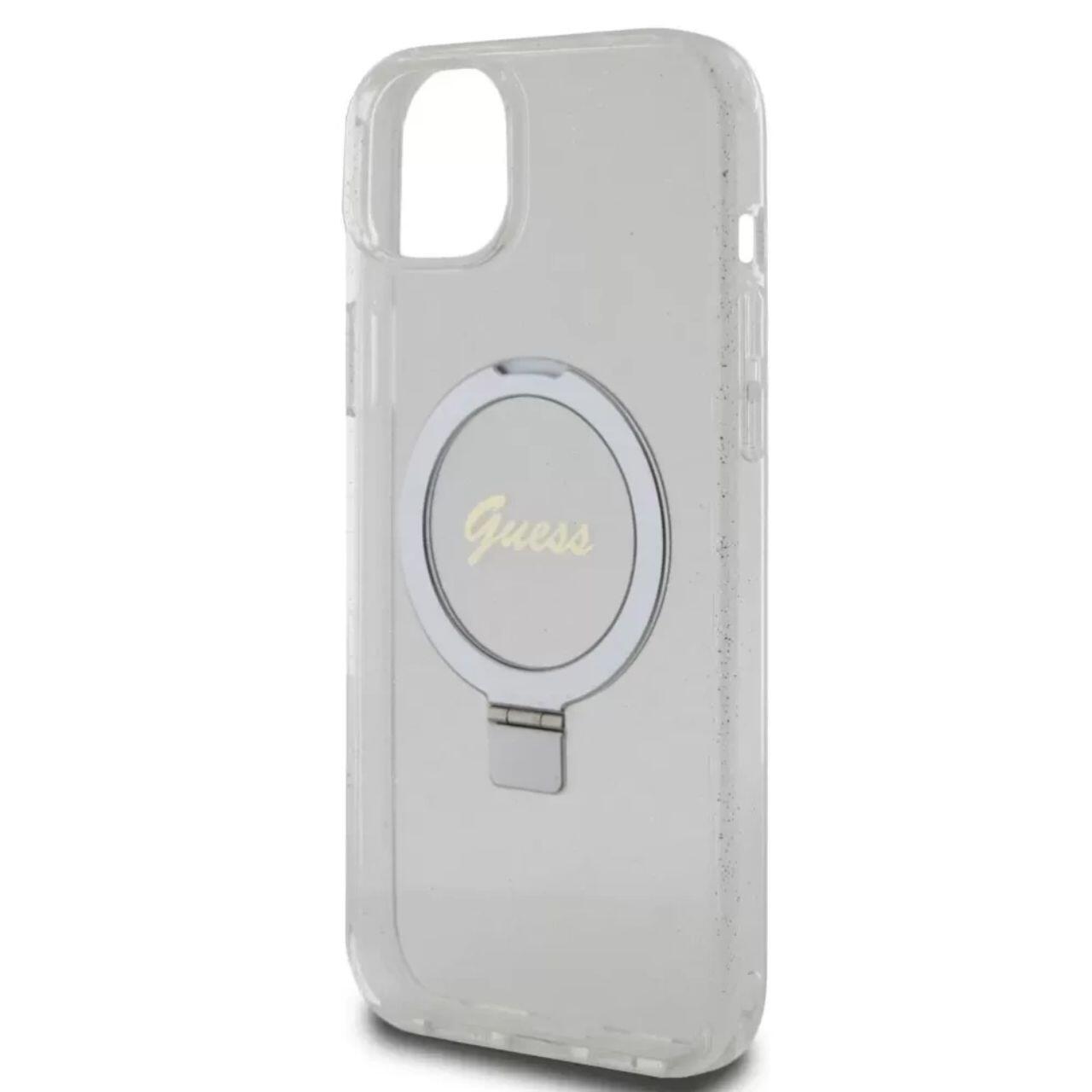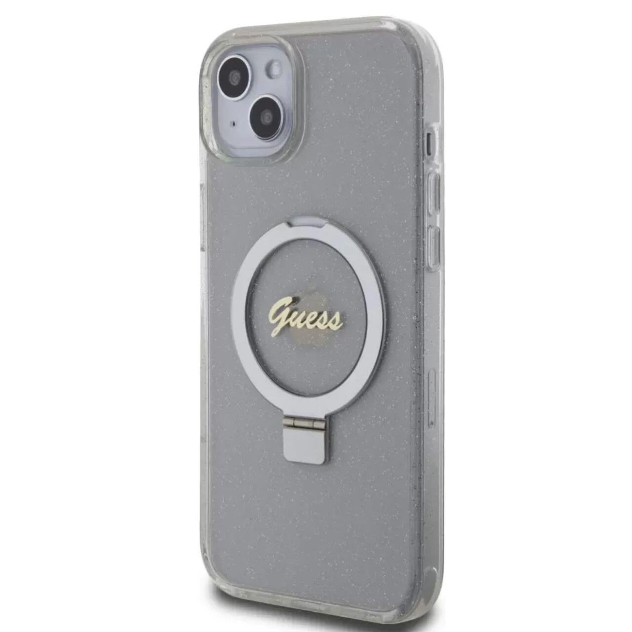 Guess Husa Ring Stand Glitter MagSafe iPhone 15 Plus Transparent