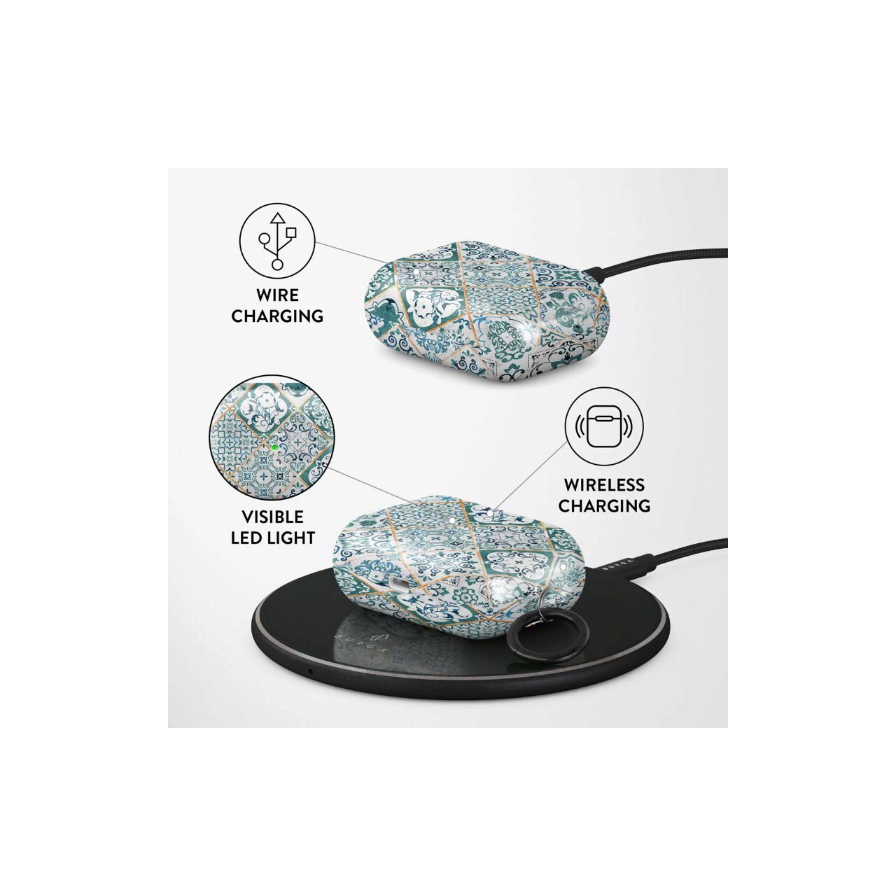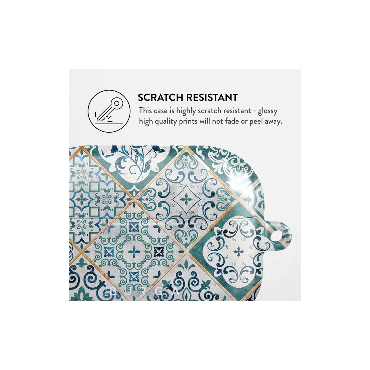Nu va perturba capacitatile de incarcare wireless ale modelului Exista chiar si un indicator luminos cu LED pentru a dovedi acest lucru (nu va faceti griji, incarcarea cu fir functioneaza in continuare). Cand este montata, husa BURGA va proteja carcasa delicata Apple Airpods 3 de sub ea de zgarieturi, lovituri si caderi, ramanand in acelasi timp fara zgarieturi. Imprimeurile cu modele de design sunt de inalta calitate si nu se vor dezlipi sau decolora niciodata - datorita tehnologiei noastre unice de imprimare. Si, in cele din urma, o carabina la indemana este acolo pentru a va face viata mai usoara si mai convenabila: pur si simplu puneti-o in jurul cheilor sau buclei de centura si abordati ziua din fata.