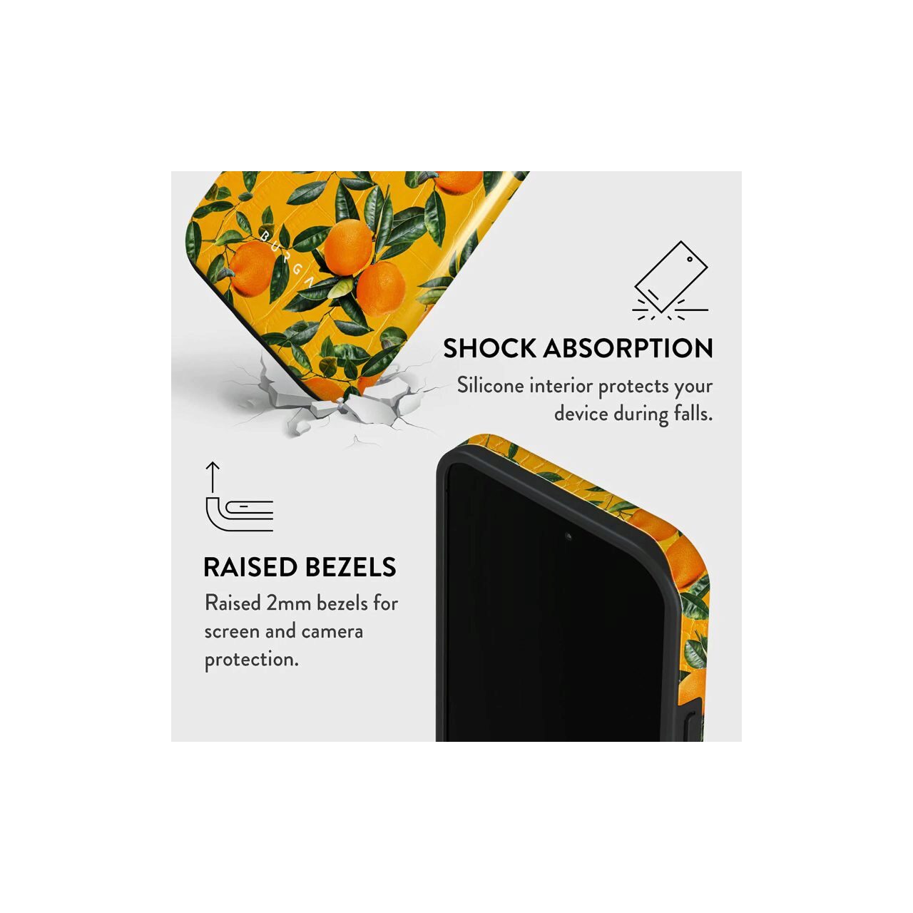 Husa Dual Layer Orange Lemonade de la Burga este proiectata in mod unic cu o structura hibrid dual-strat. Stratul interior de TPU silicon si o carcasa exterioara de PC rezistenta, de calitate militara, ofera absorbtie la soc, durabilitate si aparare robuza impotriva zgarieturilor in timp ce ramele inaltate de 2 mm ofera protectie a ecranului si a camerei.