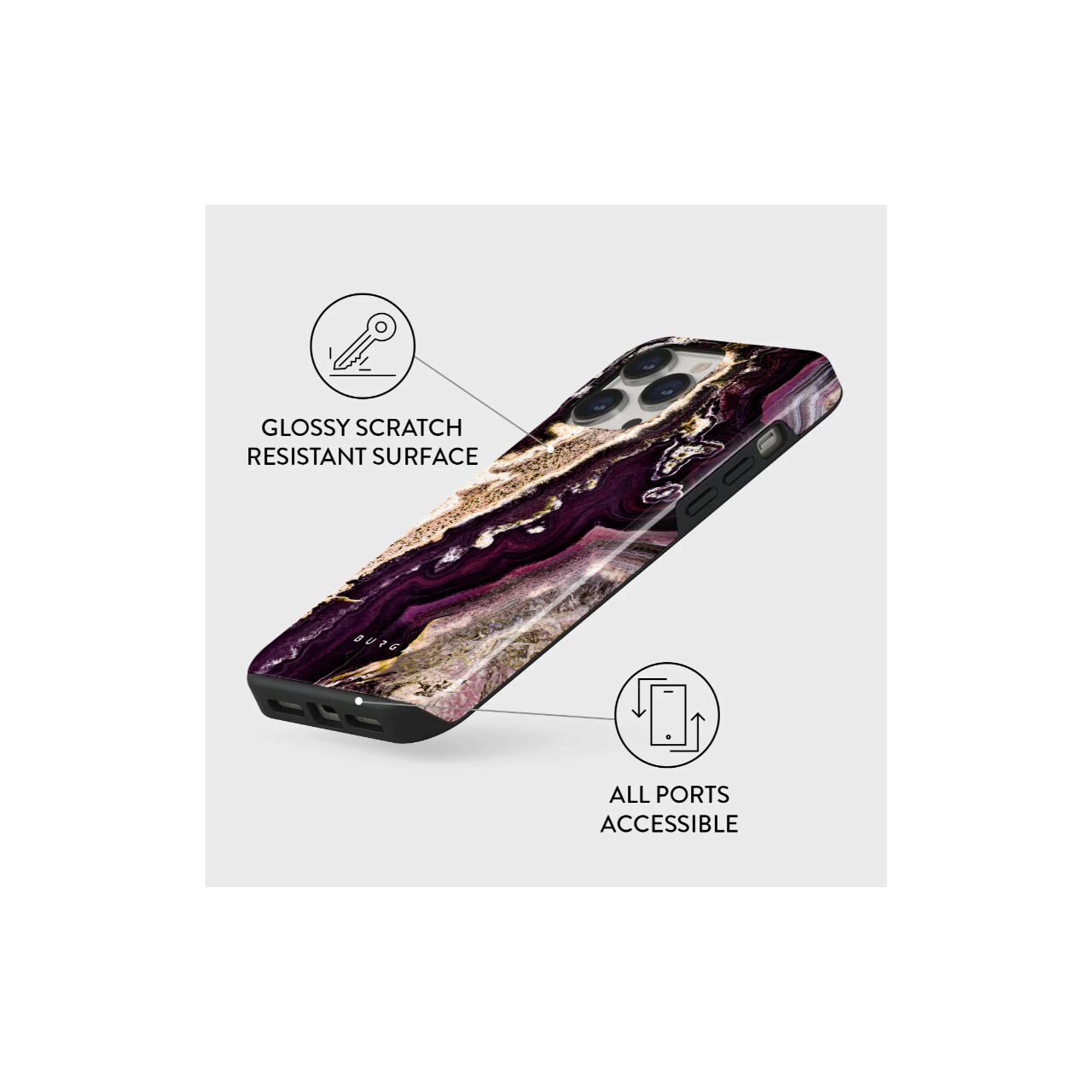 Husa Dual Layer Purple Skies iPhone 14 Pro Max de la Burga este proiectata in mod unic cu o structura hibrid dual-strat. Stratul interior de TPU silicon si o carcasa exterioara de PC rezistenta, de calitate militara, ofera absorbtie la soc, durabilitate si aparare robuza impotriva zgarieturilor in timp ce ramele inaltate de 2 mm ofera protectie a ecranului si a camerei.