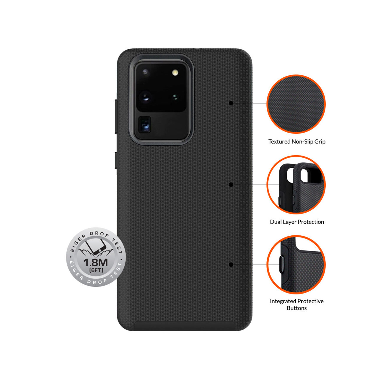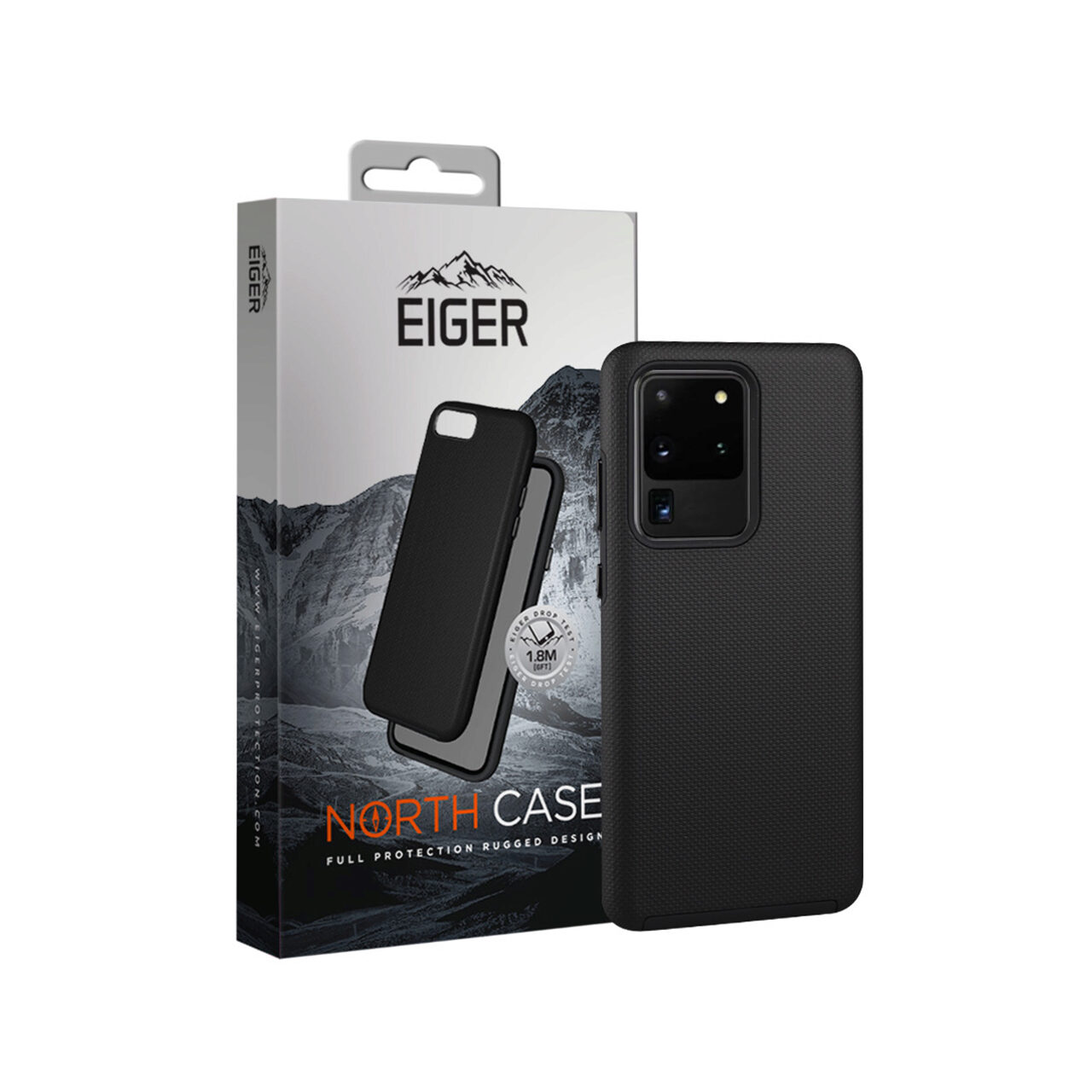 Husa North Case de la Eiger pentru Samsung Galaxy S20 Ultra este confectionata din doua straturi: unul interior din material flexibil (TPU silicon) si unul exterior din material dur (Policarbonat). Materialul din interior preia socurile, iar policarbonatul exterior protejeaza telefonul dumneavoastra impotriva zgarieturilor si cazaturilor. Este testata si proiectata pentru a rezista cazaturilor de la inaltimi de pana la 1.8 metri, marginile ramei putin inaltate protejand si ecranul.