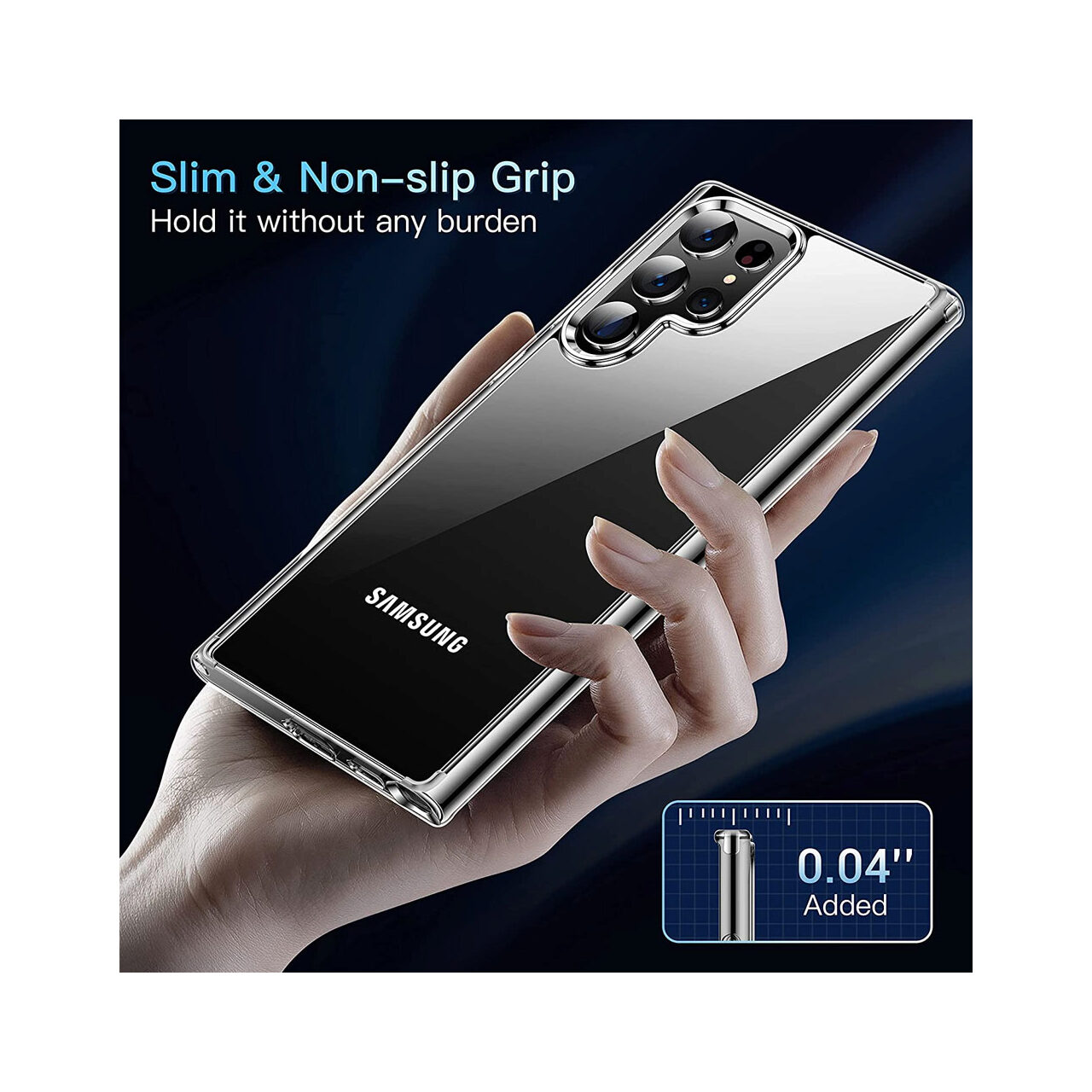Husa silicon Ultraslim Lemontti pentru Samsung Galaxy S22 Ultra este cea mai subtire protectie din silicon prezenta in momentul de fata in piata interna - numai 0,33mm. Abia vizibila, aceasta husa transparenta din silicon se muleaza perfect pe formele telefonului acoperind eficient suprafata acestuia, inclusiv butoanele de volum si power; are deschideri la toate porturile.