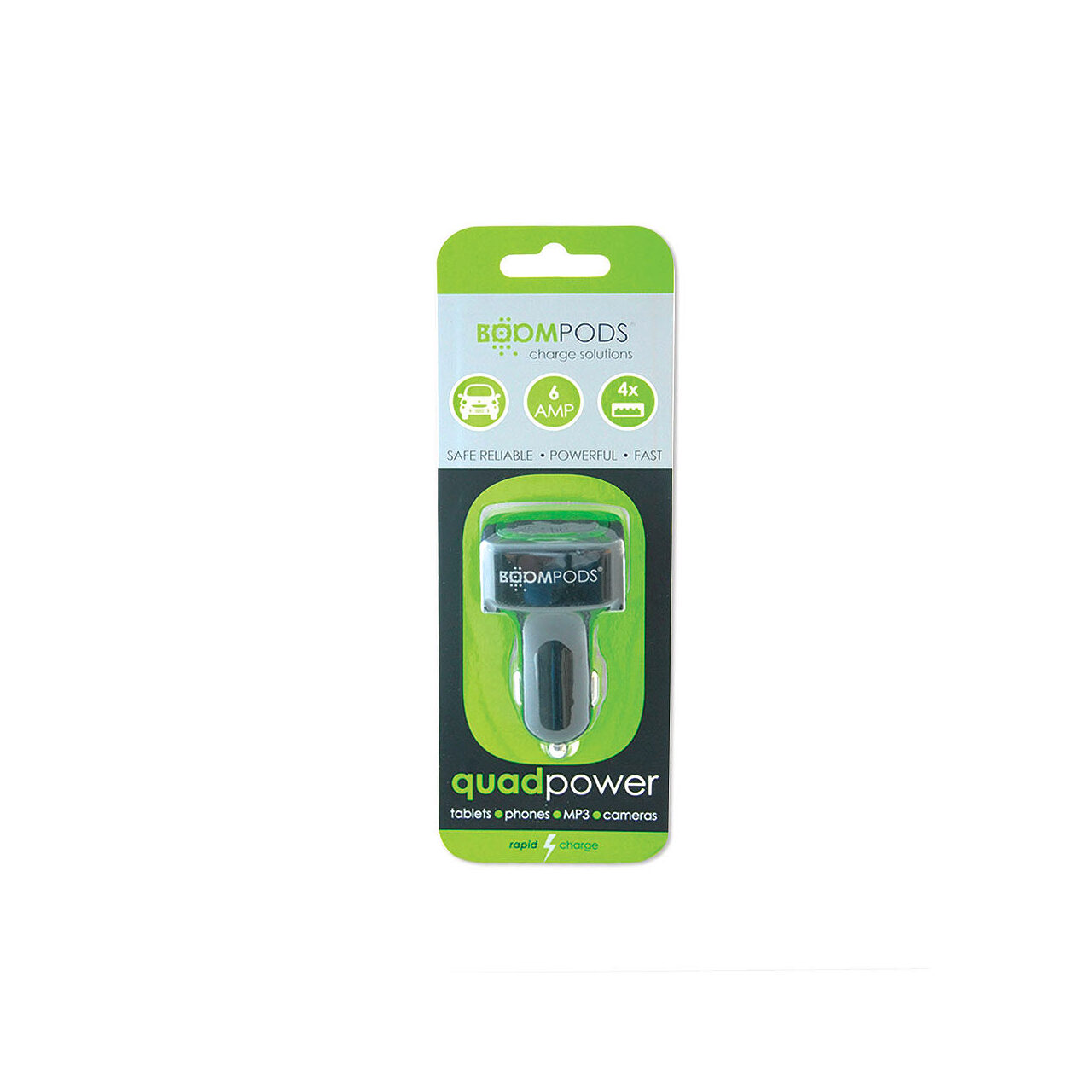 Incarcatorul auto 6A Quad USB de la Boompods are o forma ergonomica ce se potriveste in aproximativ toate tipurile de masini, fiind capabil sa incarce simultan patru dispozitive. Este ideal pentru incarcarea dispozitivelor mobile, telefoane, tablete, Mp3 player sau GPS.
