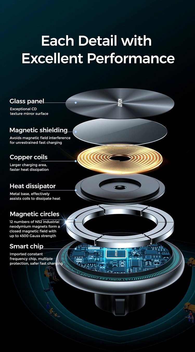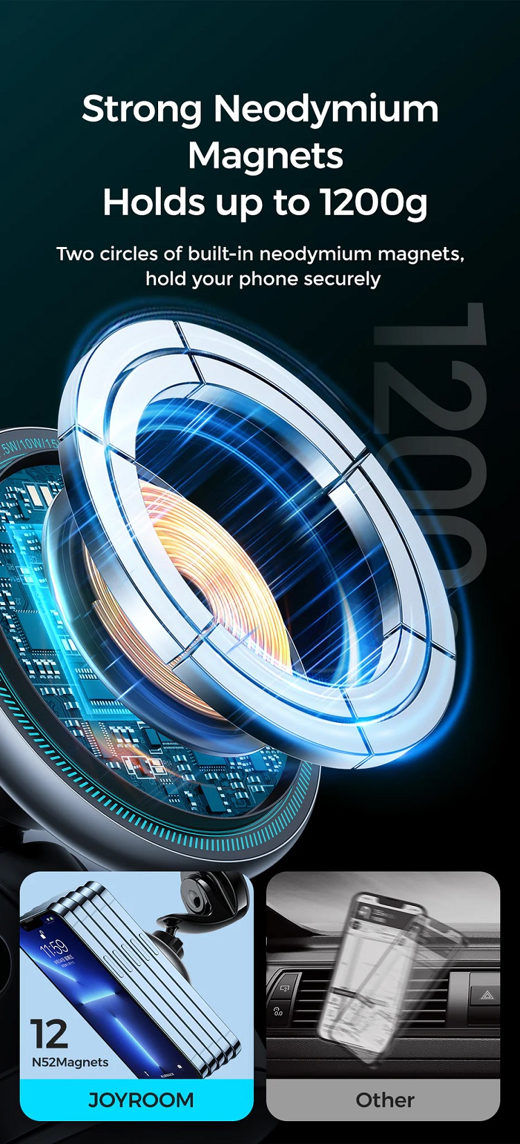Suportul este echipat cu 12 magneti de neodim in doua cercuri care vor tine si telefoane mai grele si mai mari chiar si cu dimensiunea de 6,7 inci.