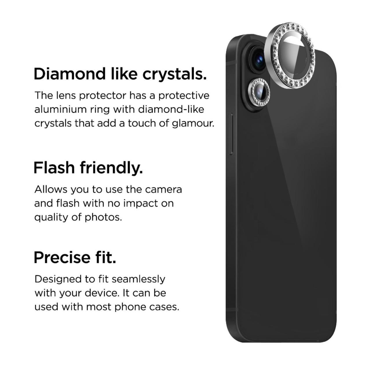 Folia Sticla Camera Diamond Lens pentru iPhone 16 / 16 Plus, este modelata pentru a se potrivi perfect cu, camerele telefonului. Are un inel de protectie cu cristale asemanatoare unui diamant care adauga o nota de farmec.