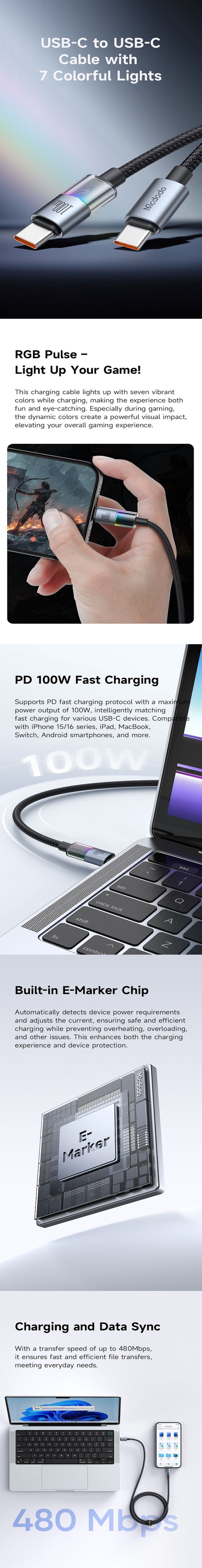 Mcdodo Cablu Type-C la Type-C 100W, ofera incarcare rapida de pana la 100W, iluminare LED multicolora si o constructie durabila, perfect adaptata utilizarii zilnice. Este o solutie stabila, sigura si rezistenta pentru dispozitive moderne cu port USB-C.