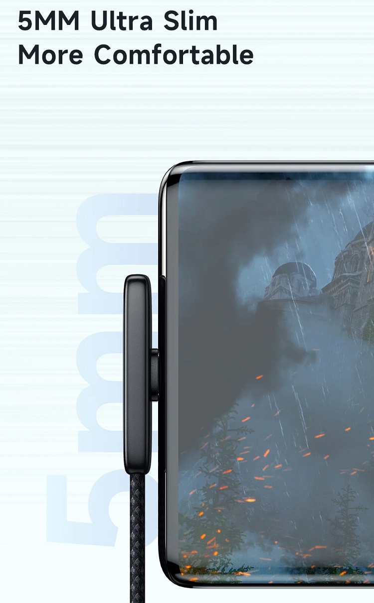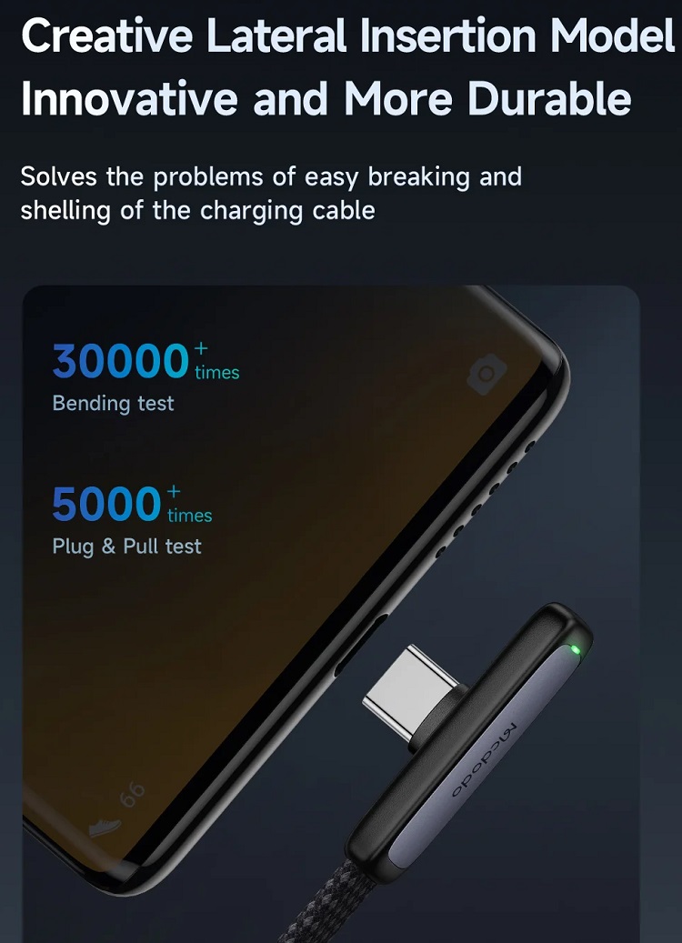 Se remarca prin conectorul sau Type-C la 90° (unghi drept), conceput special pentru a facilita utilizarea confortabila a dispozitivului in timp ce acesta se incarca (ideal pentru gaming, vizionare filme sau navigare). Forma plata a cablului previne incurcarea inestetica si ofera o flexibilitate sporita.
