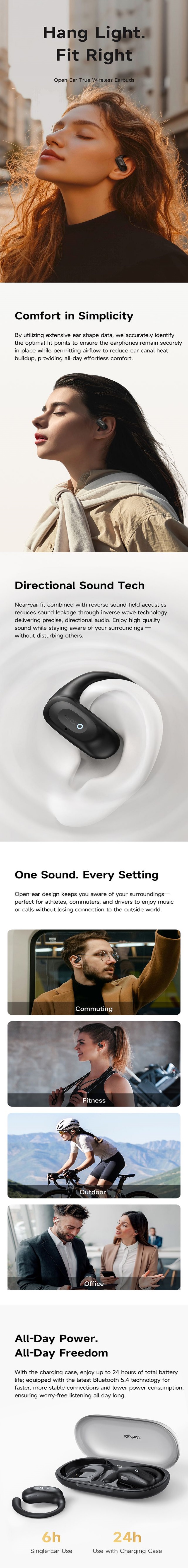 Castile Bluetooth Wireless Open-Ear Mcdodo, se pozitioneaza ergonomic in afara urechii, astfel incat sa nu blocheze canalul auditiv. Aceasta permite sa fii mereu constient de sunetele din jur, fie ca te afli in trafic, la birou sau in transportul public. Designul ergonomic ofera confort maxim chiar si la purtarea pe perioade lungi, eliminand presiunea si disconfortul tipic castilor clasice.