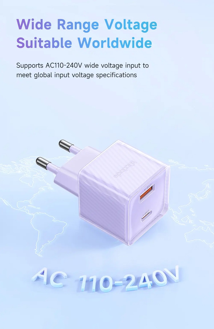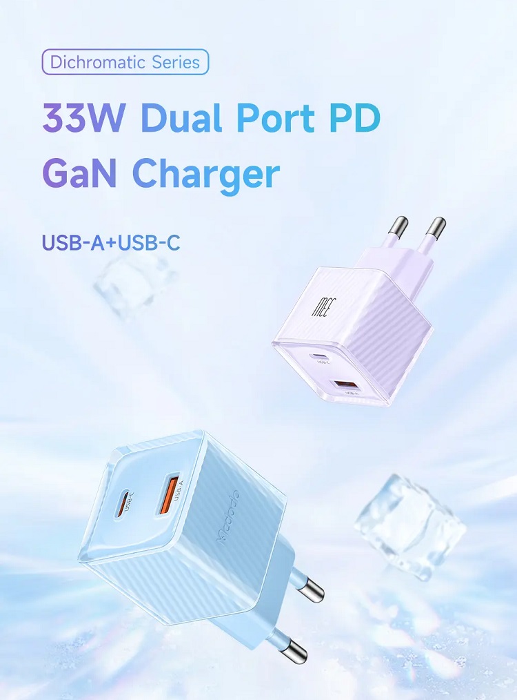 Incarcatorul Retea Dual Port Type-C si USB-A Dichromatic, Fast Charging PD 33W de la Mcdodo, are un design elegant si minimalist, a fost creat pe baza tehnologiei inovatoare GaN, cu o putere de pana la 33W va permite incarcarea a doua dispozitive simultan.
