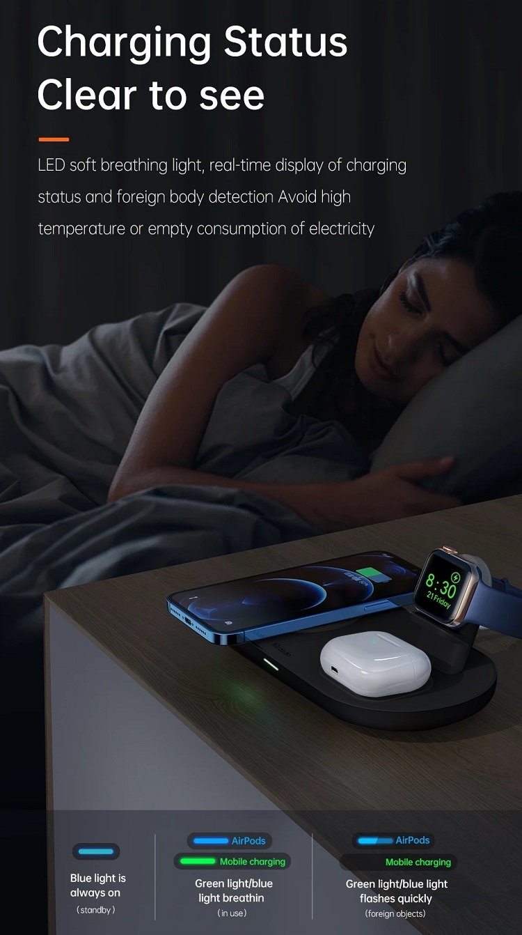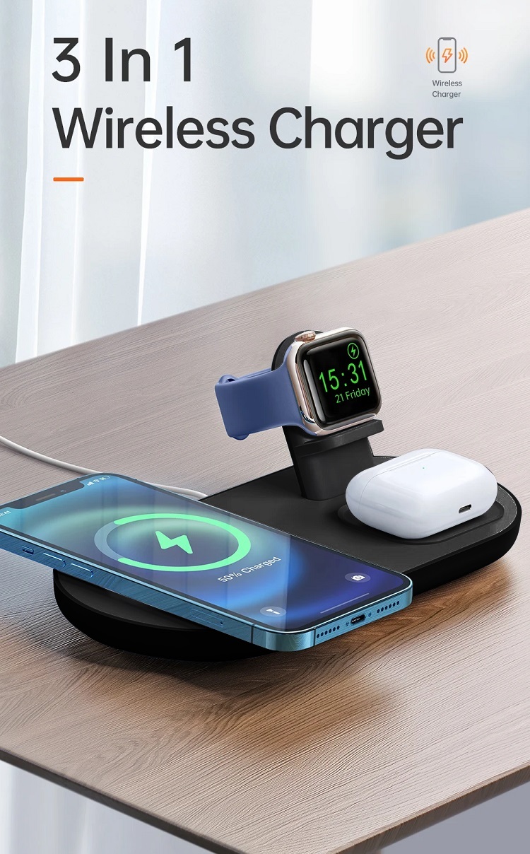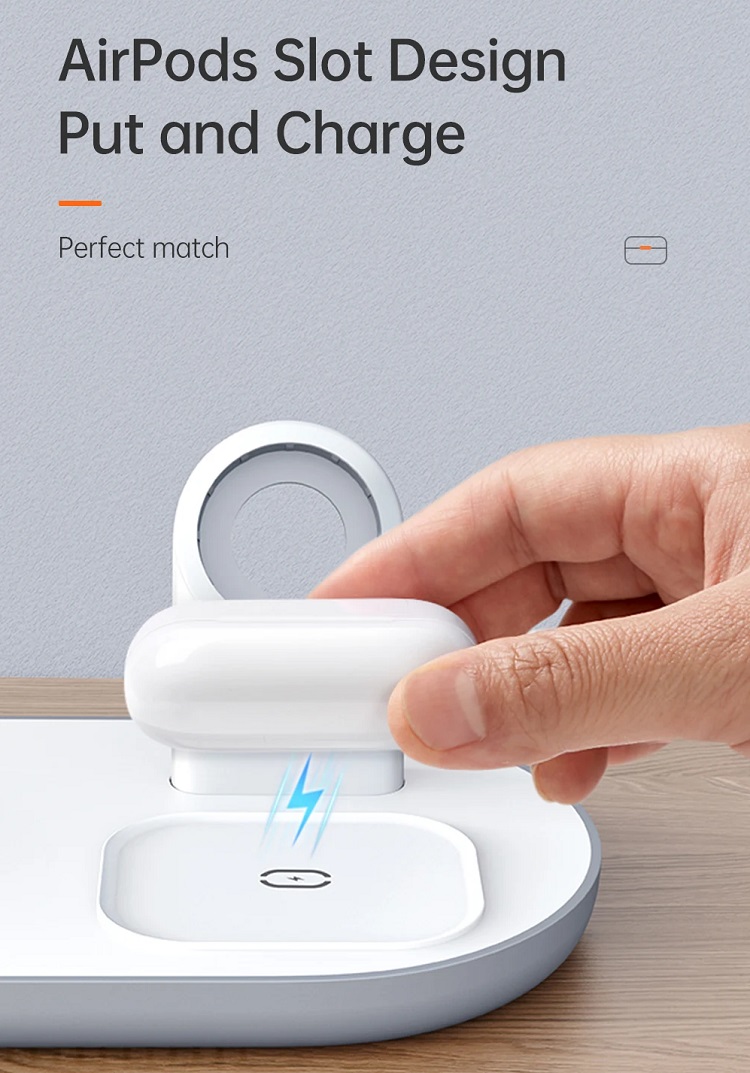 Incarcatorul Trio Wireless Charging Pad pentru telefon / TWS / Apple Watch de la Mcdodo accepta incarcare rapida cu pana la 15 W de putere maxima si accepta MagSafe. Drept urmare, incarcarea va dura doar cateva momente! In plus, veti fi informat despre starea de functionare a incarcatorului prin indicatorul luminos incorporat.
