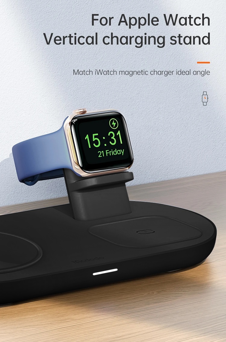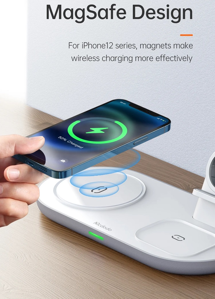 Incarcatorul Mcdodo va permite sa va incarcati fara fir smartphone-ul, ceasul inteligent si castile TWS in acelasi timp. Un suport special va va permite sa va incarcati ceasul Apple intr-o pozitie orizontala, iar suportul pentru MagSafe face procesul de incarcare pentru iPhone-uri mai eficient.