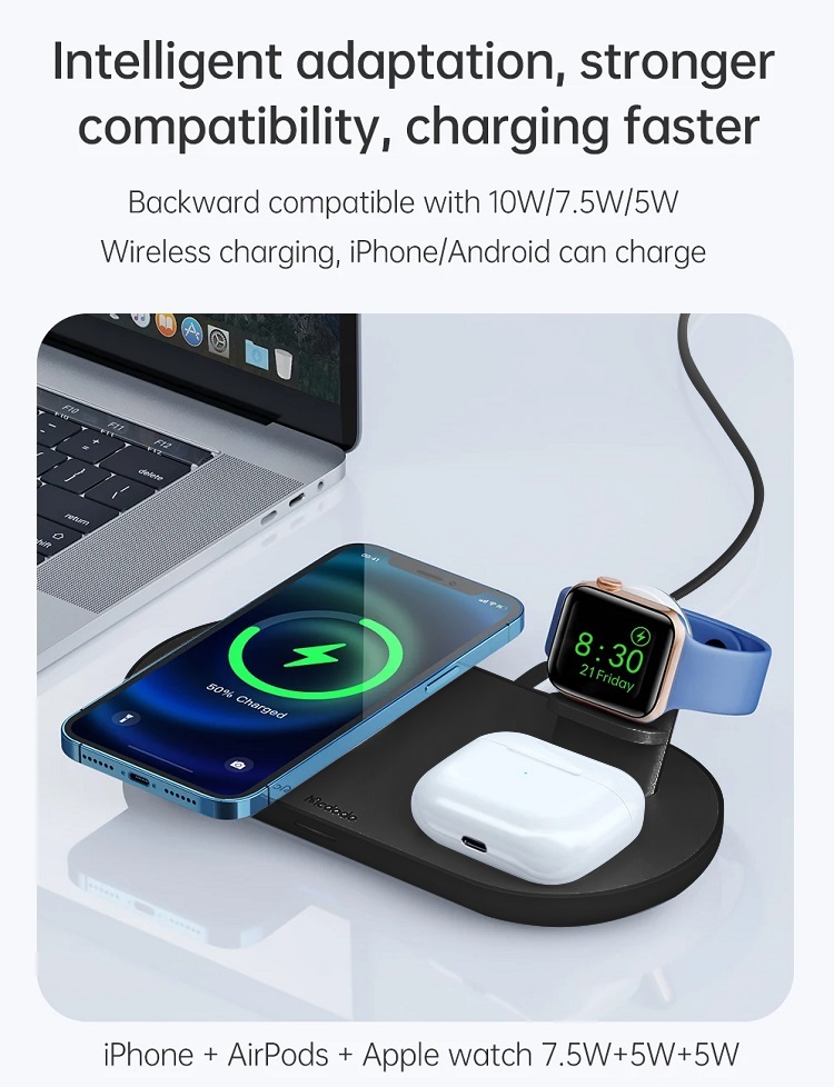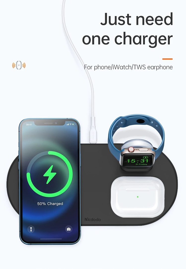 Mcdodo Incarcator Trio Wireless Charging Pad pentru telefon / TWS / Apple Watch, 15W, Negru