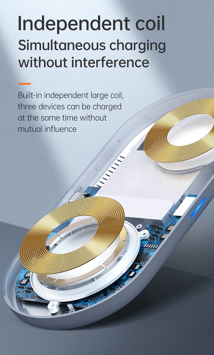 - iPhone (7,5 W) + Airpods (5 W) + Apple Watch (5 W),Telefon Android (15W) + TWS (5W) + Apple Watch (5W)