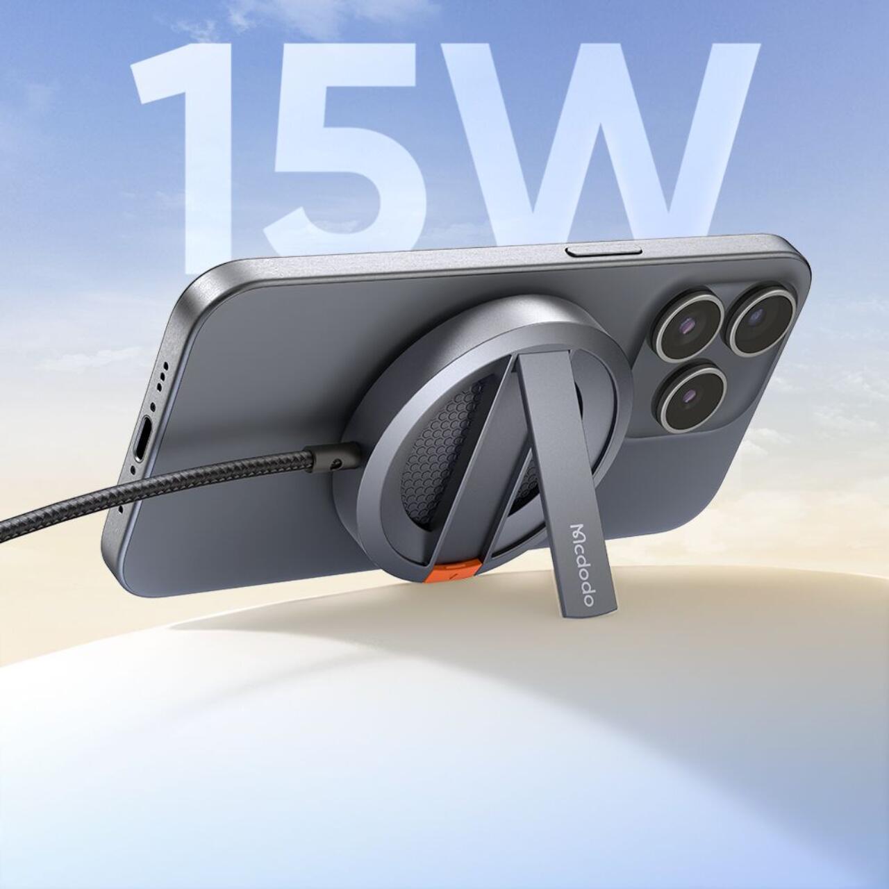 Incarcatorul wireless Mcdodo, este conceput pentru utilizatorii care cauta atat performanta, cat si confort in utilizarea zilnica. Dispozitivul combina tehnologia MagSafe cu un suport pliabil integrat, oferind nu doar incarcare rapida, ci si un unghi optim de vizualizare pentru apeluri video, vizionarea de continut sau utilizarea telefonului pe birou.