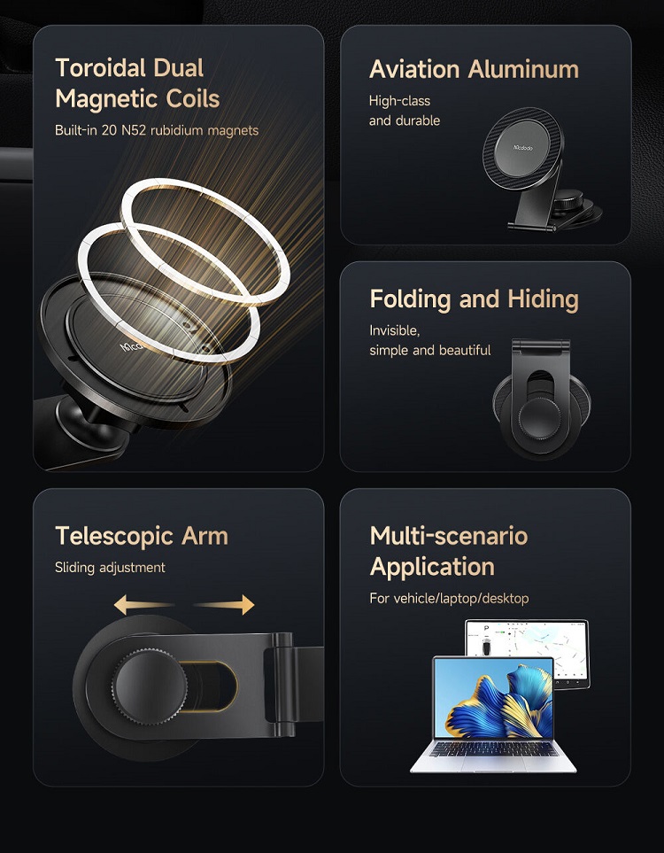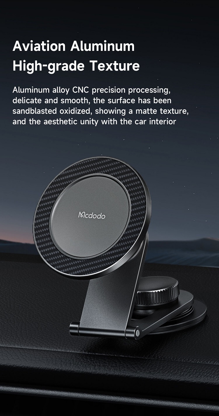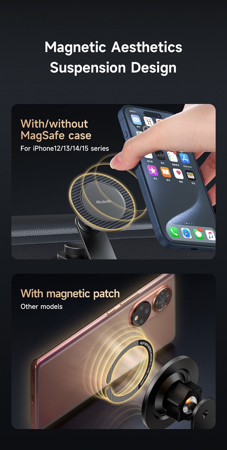 Fabricat din aluminiu premium de calitate pentru aviatie, acest suport este o combinatie uimitoare de forma si functie, construita pentru a dura.Compatibil cu sau fara husa MagSafe pentru seria iPhone 12/13/14/15 si alte modele, bobinele magnetice duble toroidale ofera capacitati puternice de absorbtie si rezistenta la cadere.