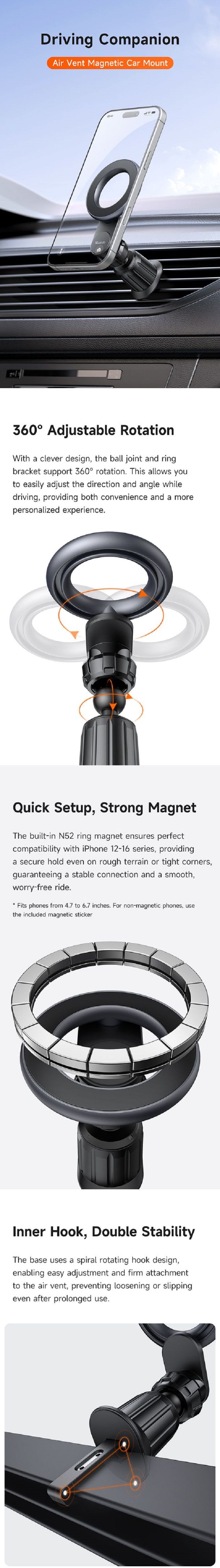 Suportul Auto Magnetic prindere la sistemul de ventilatie de la Mcdodo este un accesoriu compact, discret si durabil, proiectat pentru a mentine telefonul stabil si vizibil, fara a compromite vizibilitatea asupra drumului.