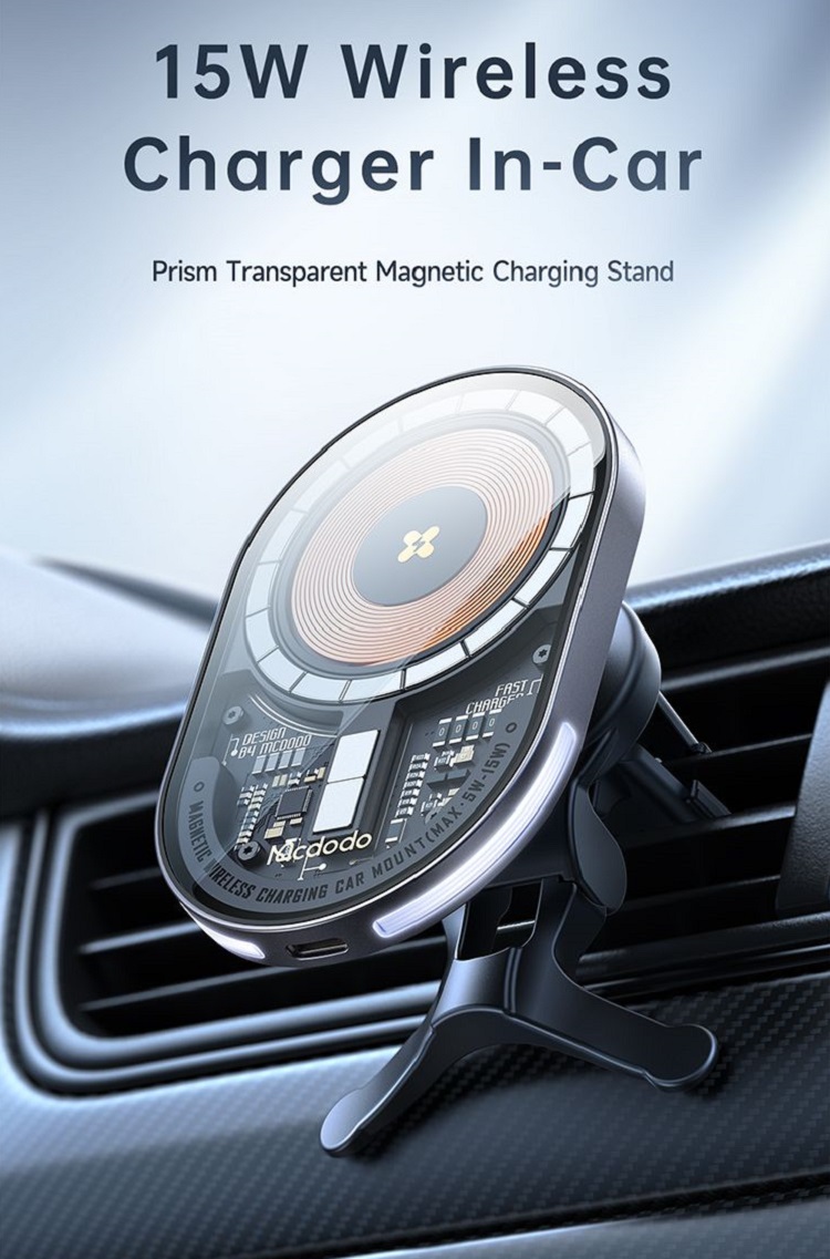 Mcdodo Suport Auto Magnetic Prism Series cu incarcare wireless, MagSafe, 15W, prindere la sistemul de ventilatie, Transparent