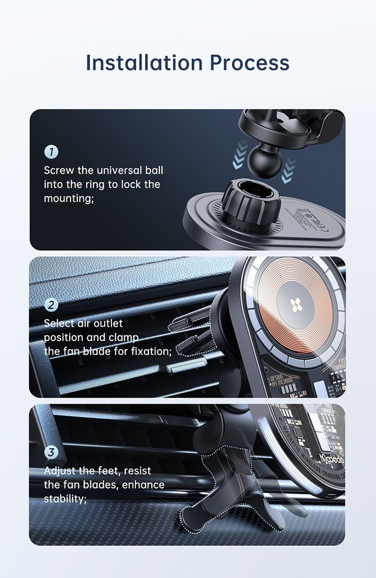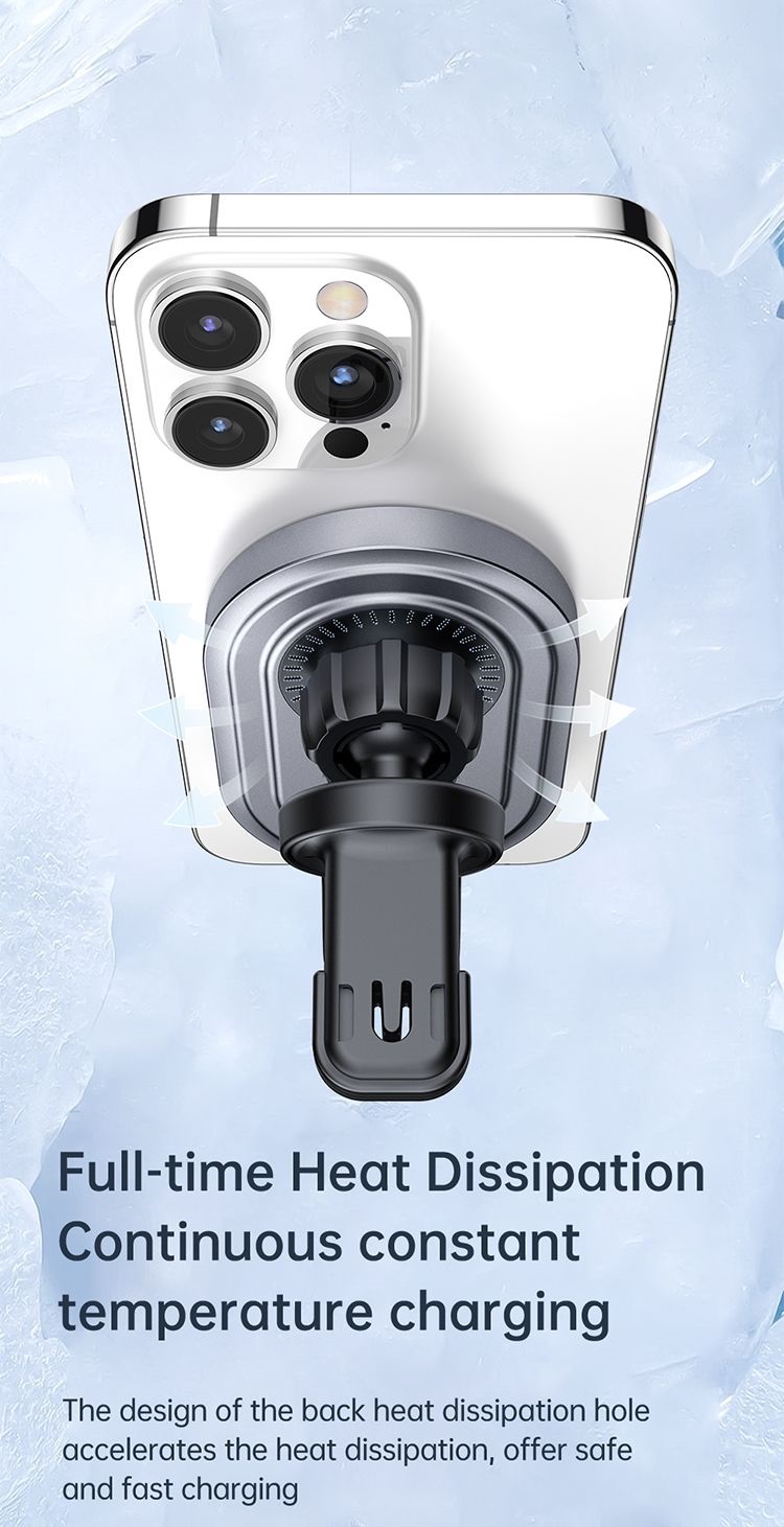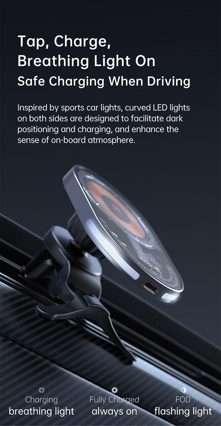 Designul gaurii din spate pentru disiparea caldurii accelereaza disiparea caldurii, stabilizeaza temperatura constanta, evita oprirea incarcarii din cauza temperaturilor ridicate sau deteriorarea smartphone-ului. Lumina LED de respiratie: luminile cu LED-uri arc sunt situate pe ambele parti ale fundului, ceea ce face convenabil incarcarea intr-un loc intunecat al masinii, astfel incat sa puteti afla intotdeauna starea de incarcare. In timpul incarcarii, LED-ul se va aprinde ca si cum ar fi respiratia. Ledul va ramane aprins cand incarcarea este finalizata. Lumina LED clipeste rapid cand detecteaza obiecte straine.