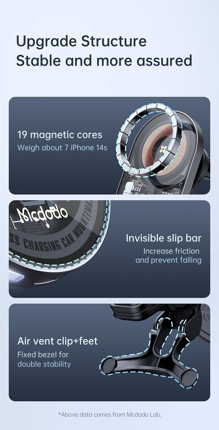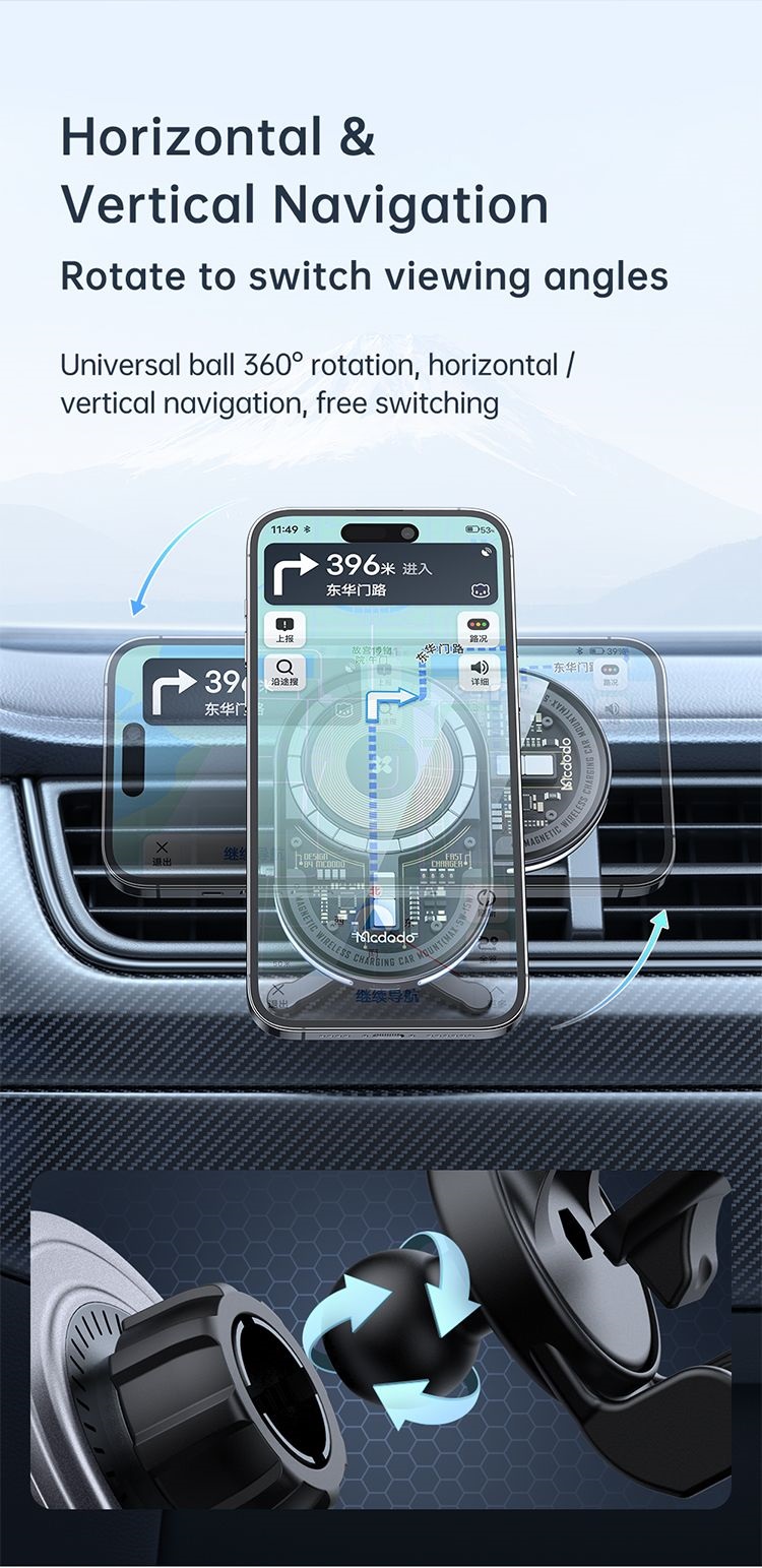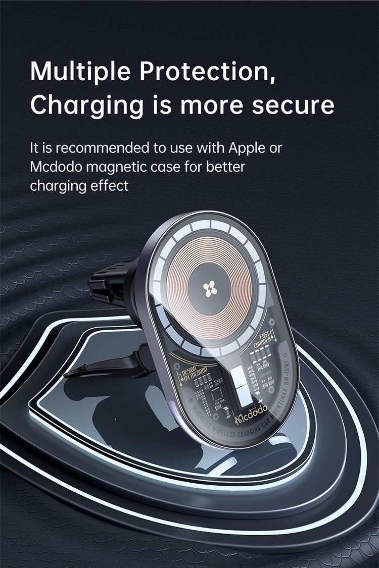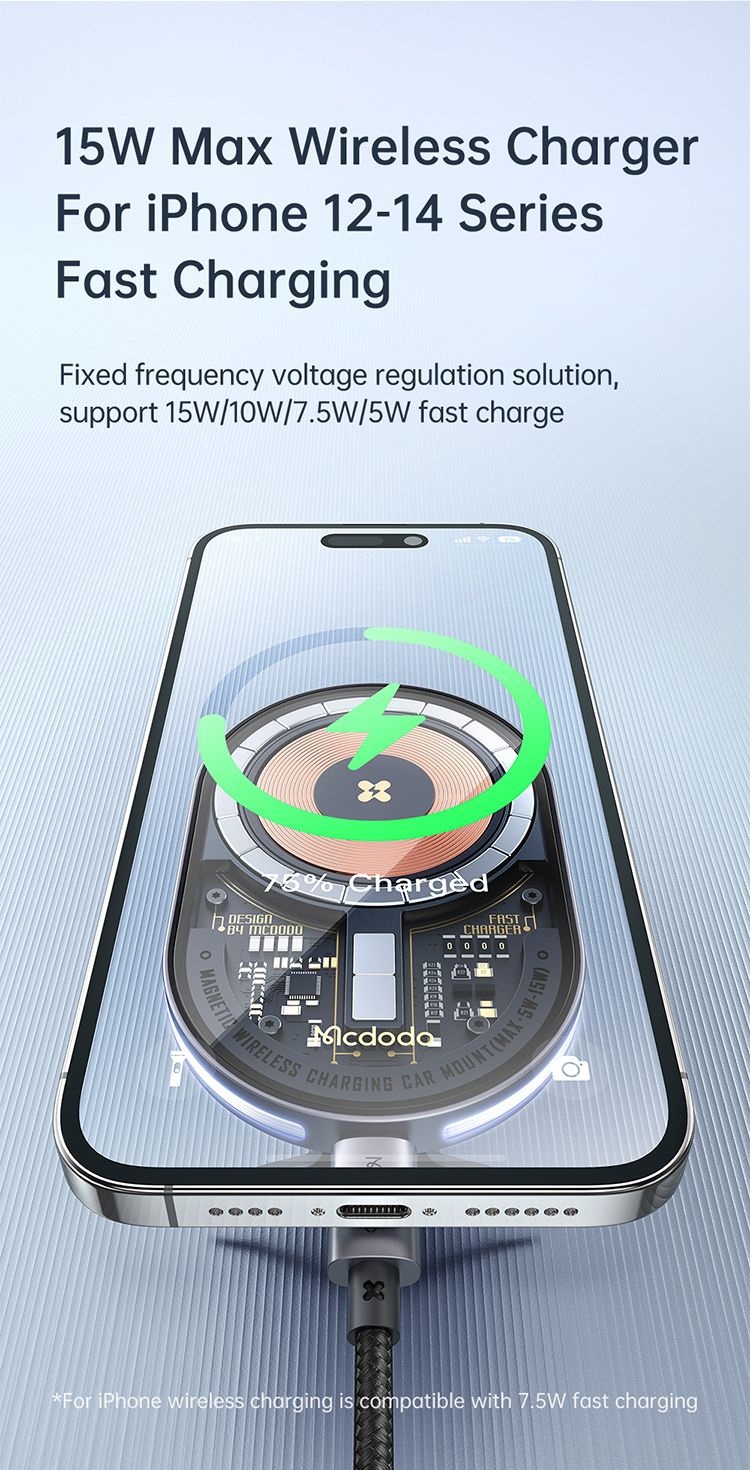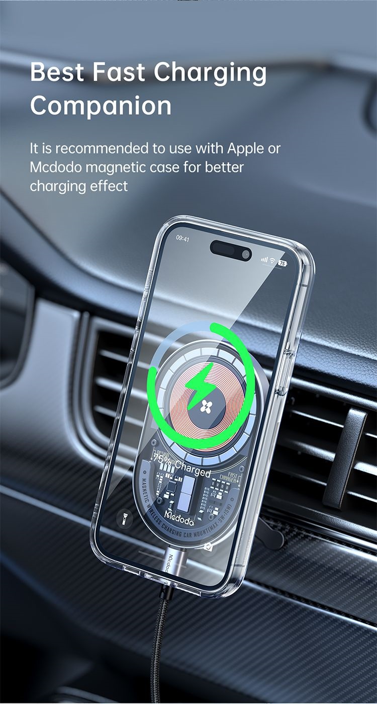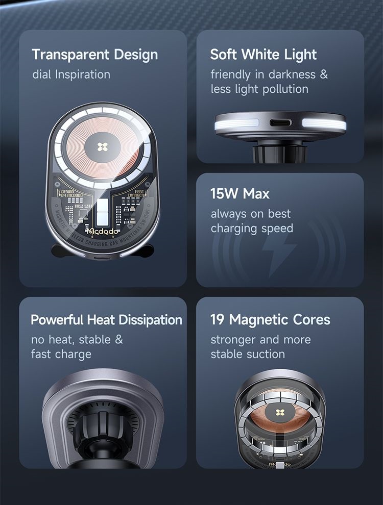 Suport Auto Magnetic Prism Series cu incarcare wireless de la Mcdodo este proiectat pentru seriile iPhone 15/15Pro si iPhone 14/13/12 si utilizeaza 19 miezuri magnetice mari pentru o aspiratie si agitare imbunatatite. Accepta o iesire de pana la 15 W si o incarcare rapida, cum ar fi PD2.0, PD3.0, QC2.0, QC3.0 etc.