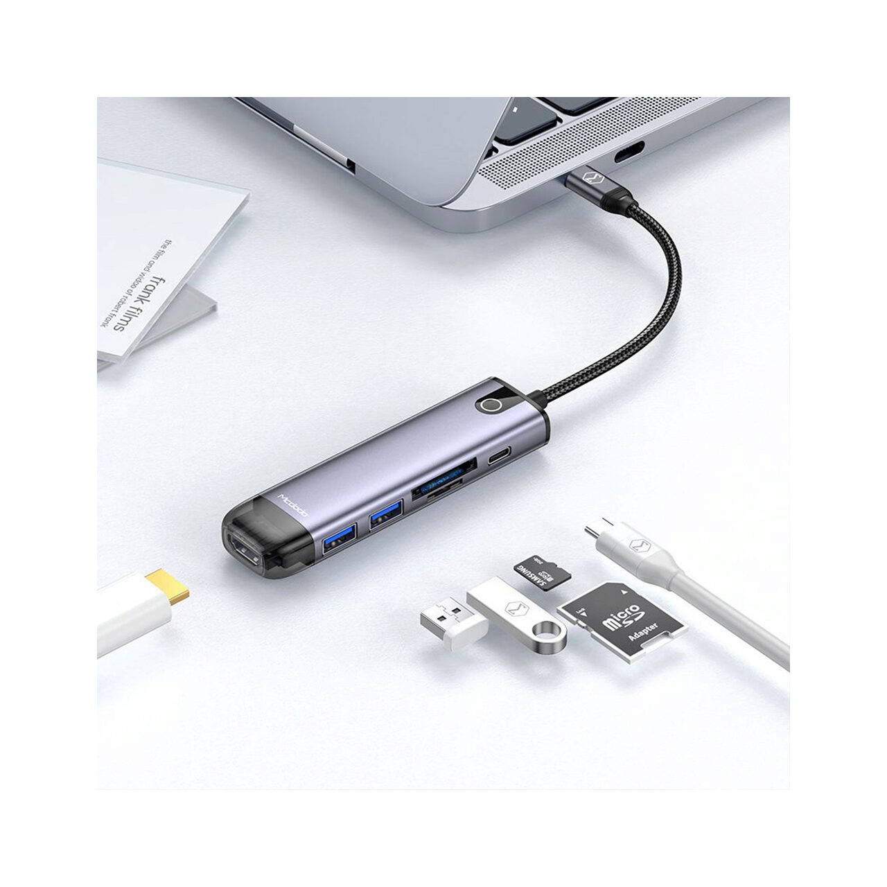 - adaptor multihub Type-C la HDMI, USB X 2, USB-C, TF, SD