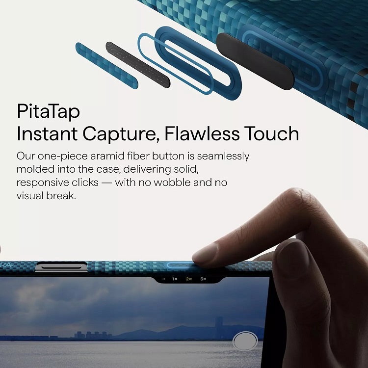 Carcasa de mai putin de 1 mm protejeaza butonul de control al camerei cu fibra de aramida, in timp ce un strat capacitiv ascuns permite atingerea si derularea usoara. Integrarea neteda pastreaza textura de aramida pentru un control precis si receptiv.
