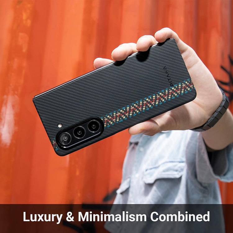Husa MagEZ Air Aramida 600D de la Pitaka pentru Samsung Galaxy Z Fold5, este fabricata din fibra de aramida care este de cinci ori mai rezistenta decat otelul, dar de cinci ori mai usoara, ofera un aspect si o senzatie placuta, protejand in acelasi timp telefonul de uzura zilnica.