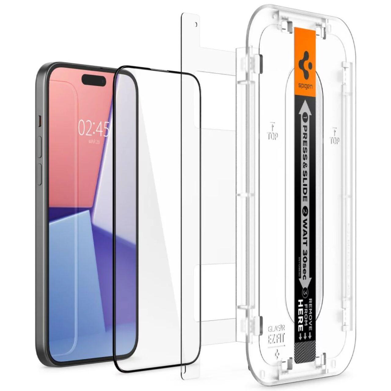 Spigen Folie Sticla Glass tR EZ Fit iPhone 15 set 2 buc, kit de montare, Black