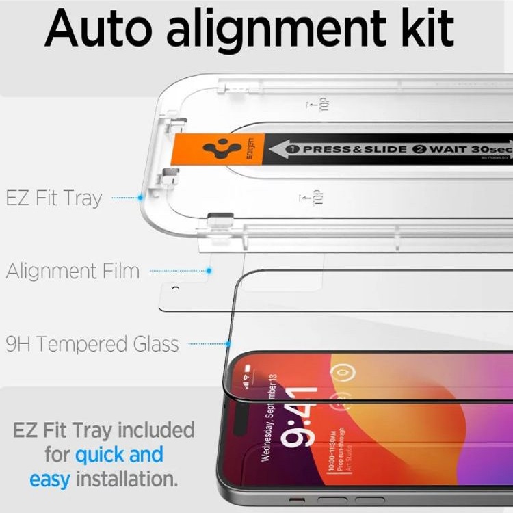 Folie Sticla Glass tR EZ Fit de la Spigen pentru iPhone 15, are un strat de acoperire cu grosimea de 0,2 mm, care a fost intarit la 9H in timpul procesului de productie acest lucru o face rezistenta la zgarieturi chiar si in contact cu obiecte ascutite precum chei sau cutite.