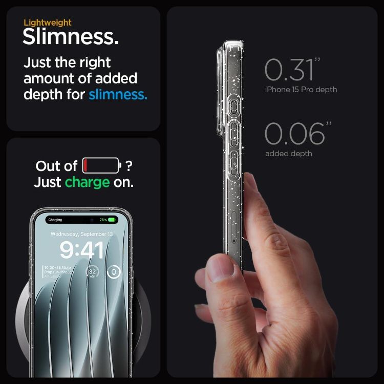 Nu adauga volum telefonului si ii ofera un plus de stralucire in lumina datorita glitter-ului incorprat in material. In jurul camerei este usor inaltata pentru a o proteja atunci cand asezati telefonul pe o suprafata plana.