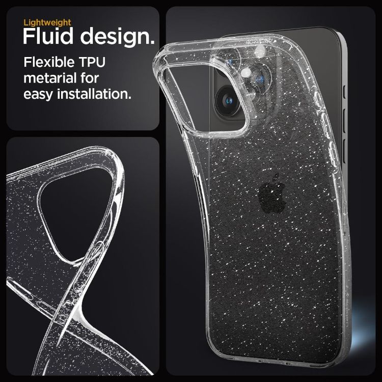 Husa Liquid Crystal Glitter iPhone 15 Pro Crystal Quartz este realizata din silicon flexibil transparent ce preia eventualele vibratii ale unui soc si protejeaza impotriva zgarieturilor.