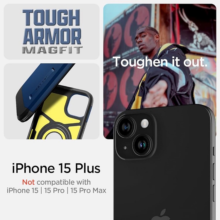 Husa Tough Armor de la Spigen pentru iPhone 15 Plus absoarbe socurile unei eventuale cazaturi cu succes datorita combinatiei de materiale de calitate folosite: invelis dur (Policarbonat) pe exterior, silicon moale pe margini si o extra protectie din spuma la interior. In plus colturile folosesc tehnologia Air Cushion ce diminueaza vibratiile socului. Este certificata military grade MIL-STD 810G-516.6 impotriva cazaturilor.