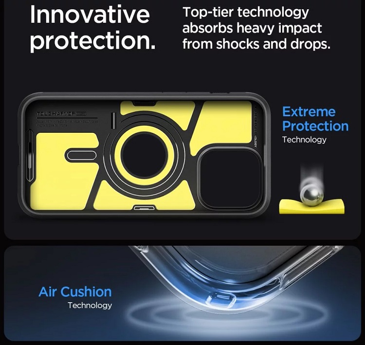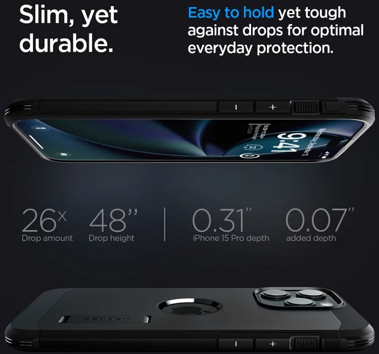 Husa Tough Armor de la Spigen pentru iPhone 15 Pro absoarbe socurile unei eventuale cazaturi cu succes datorita combinatiei de materiale de calitate folosite: invelis dur (Policarbonat) pe exterior, silicon moale pe margini si o extra protectie din spuma la interior. In plus colturile folosesc tehnologia Air Cushion ce diminueaza vibratiile socului. Este certificata military grade MIL-STD 810G-516.6 impotriva cazaturilor.