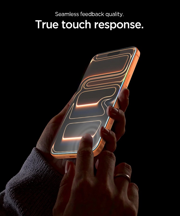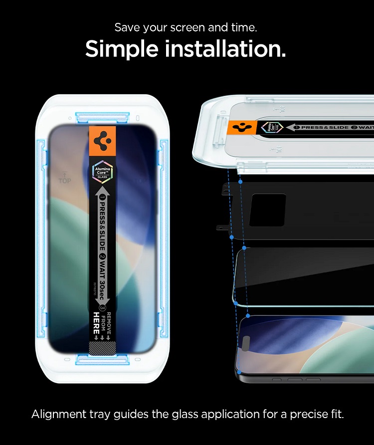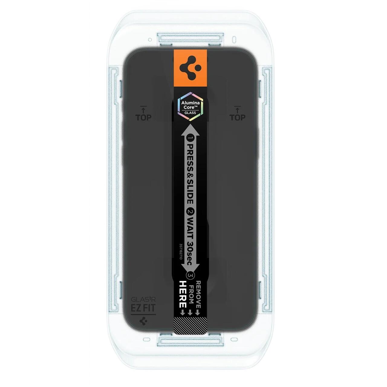 Spigen Folie Sticla cu aplicator inclus, este protejata de un cadru de montaj perfect decupat in fata telefonului, datorita caruia il puteti pozitiona perfect pe ecran.