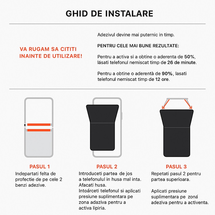 Designul carcasei din doua piese, proiectat cu precizie, se fixeaza in siguranta in pozitie (adeziv inclus pentru a lipi dispozitivul de carcasa). Partea spate din PC, rama surround din TPU. Colturi Air-Soft pentru amortizarea impactului, rama surround ridicata a ecranului ofera protectie suplimentara impotriva zgarieturilor si crapaturilor. Rama camerei ridicata pentru a proteja lentila de zgarieturi.