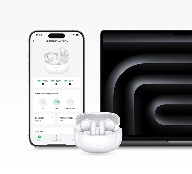 Castile Wireless HiTune T3 Pro, Bluetooth 5.4 de la Ugreen, sunt casti true wireless cu tehnologie ANC, proiectate pentru utilizare zilnica, apeluri clare si personalizare audio. Designul in-ear asigura sigilare pasiva eficienta, iar aplicatia dedicata permite ajustarea fina a sunetului.