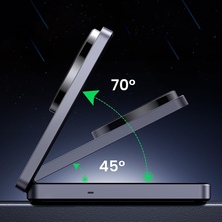 Designul sau pliabil si compact il face perfect pentru birou sau calatorii, functionand si ca suport pentru telefon in timpul incarcarii. Materialele rezistente, precum metalul si siliconul moale, asigura durabilitate si eleganta.