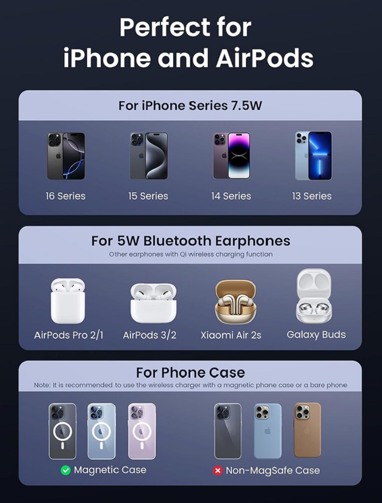 Compatibilitate: iPhone 12–16, AirPods 2/3/Pro, alte dispozitive Qi