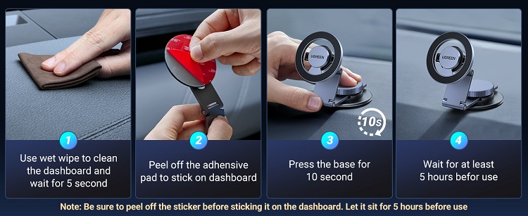 Pentru o aderenta maxima, curatati bine suprafata bordului inainte de aplicare. Dupa lipire, se recomanda sa asteptati 5 ore inainte de a atasa telefonul, permitand adezivului sa se fixeze optim.