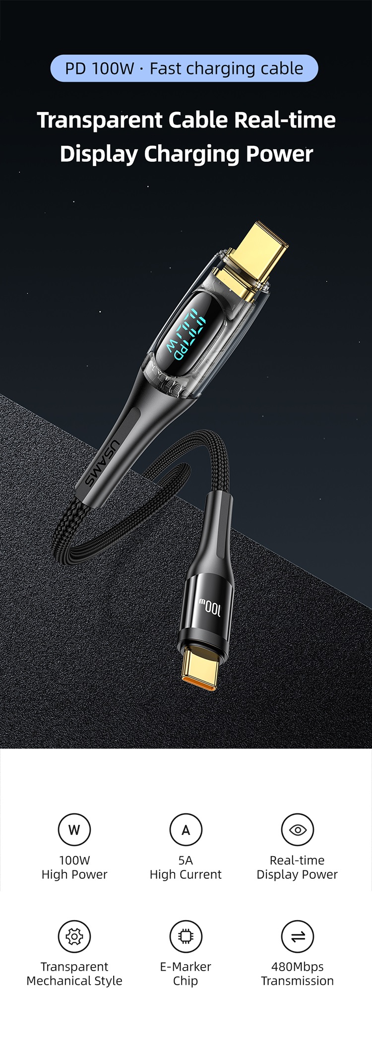 Usams Cablu Digital Type-C la Type-C Fast Charger, PD, 100W, 1.2m, Transparent / Negru