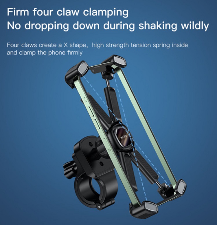 Sistemul de prindere in forma de X, cu patru cleme, fixeaza ferm telefonul si previne alunecarea chiar si pe drumuri denivelate, oferind o utilizare sigura in orice conditii.